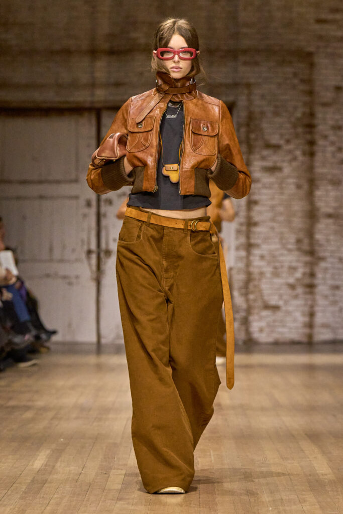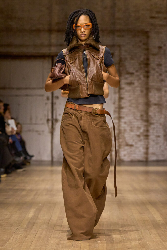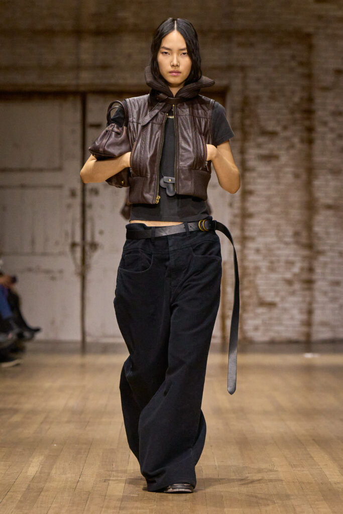 2025秋季系列的灵感源自那些充满个性和岁月痕迹的复古单品,以牛仔、软纹绒布和西装面料制成的超大尺寸廓形裤子,搭配仿缩水感T恤、运动衫、针织衫和夹克。色彩上延续了Coach经典的浓郁棕褐色和做旧感黑色,并通过混色针织、浅色水洗牛仔以及豹纹、金属针织和珠饰等元素增添亮点。