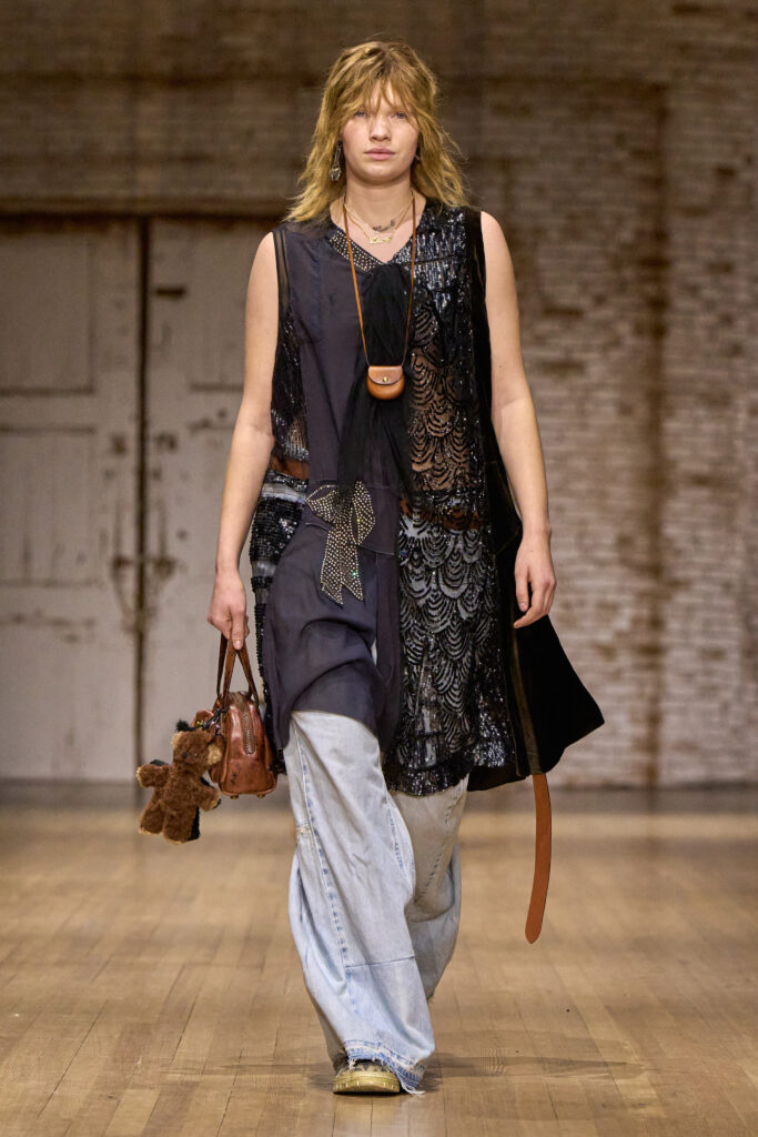 在外套设计上,包括部分由再利用单品制成的短款和窄版的飞行员夹克,及地长度版型的剪羊毛和皮革风衣,和粗呢、海军呢和仿豹纹皮草大衣。系列中还有多种菱形花纹和金银丝针织品,以及西装外套和马甲。受1920年代宽松日装裙的启发,系列中包括直筒裙、背心裙和褶皱裙,以及由复古睡衣裙和珠饰礼服改造而成的连衣裙。舒适惬意也是本季秀场的重要元素,比如水洗做旧T恤、运动衫和连帽衫,以及仿照孩子们穿旧的拖鞋而设计的毛绒鞋履。每套造型都以一条滑板风格的超宽松长裤为基础,裤脚堆叠在脚踝处,既休闲又优雅。秀场上展示的所有牛仔裤均由再利用牛仔布重塑而成,这也是Coach基于可持续视角不断探索和优化的传统面料。