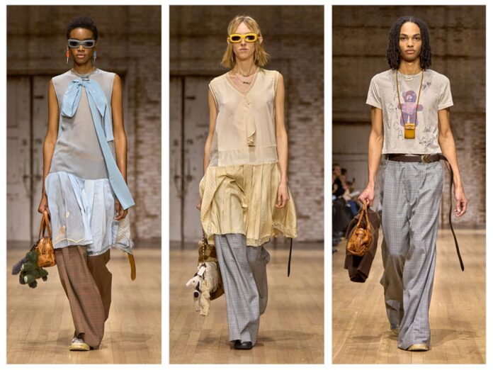 2025秋季系列的灵感源自那些充满个性和岁月痕迹的复古单品,以牛仔、软纹绒布和西装面料制成的超大尺寸廓形裤子,搭配仿缩水感T恤、运动衫、针织衫和夹克。色彩上延续了Coach经典的浓郁棕褐色和做旧感黑色,并通过混色针织、浅色水洗牛仔以及豹纹、金属针织和珠饰等元素增添亮点。
