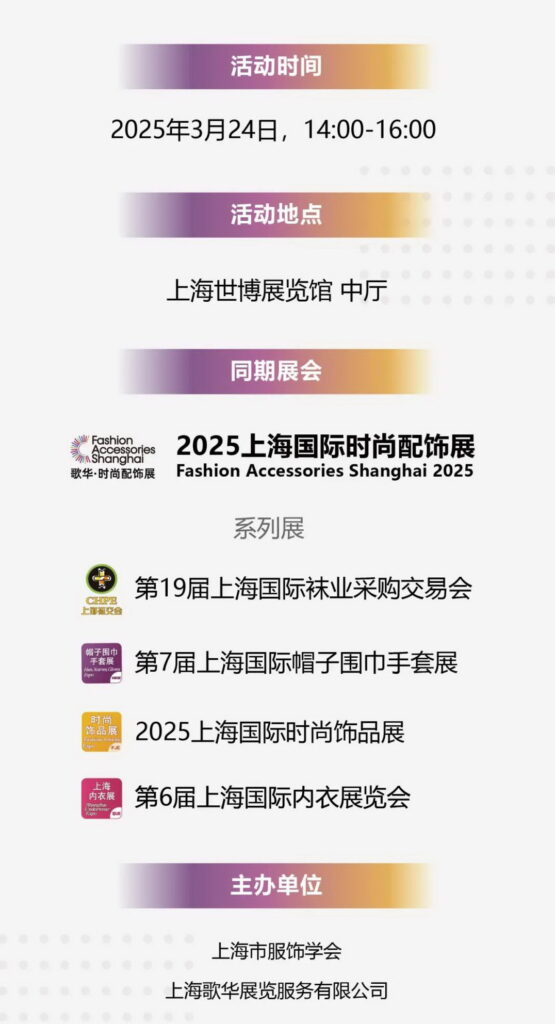 本届展会与2025上海国际时尚配饰展Fashion Accessories Shanghai系列展 — 2025上海国际时尚饰品展、第19届上海国际袜业采购交易会及第6届上海国际内衣展一同召开,总展出面积达50,000平米,预计超过900个参展商和近30,000名专业观众汇聚于此。展出包括:各类帽子、帽饰、围巾、丝巾、手套、袜子、首饰、头饰、内衣、内裤、运动内衣、原辅材料、机械设备等全品类配饰产品,呈现集全产业链、全品类、全产地的国际配饰行业风向标。