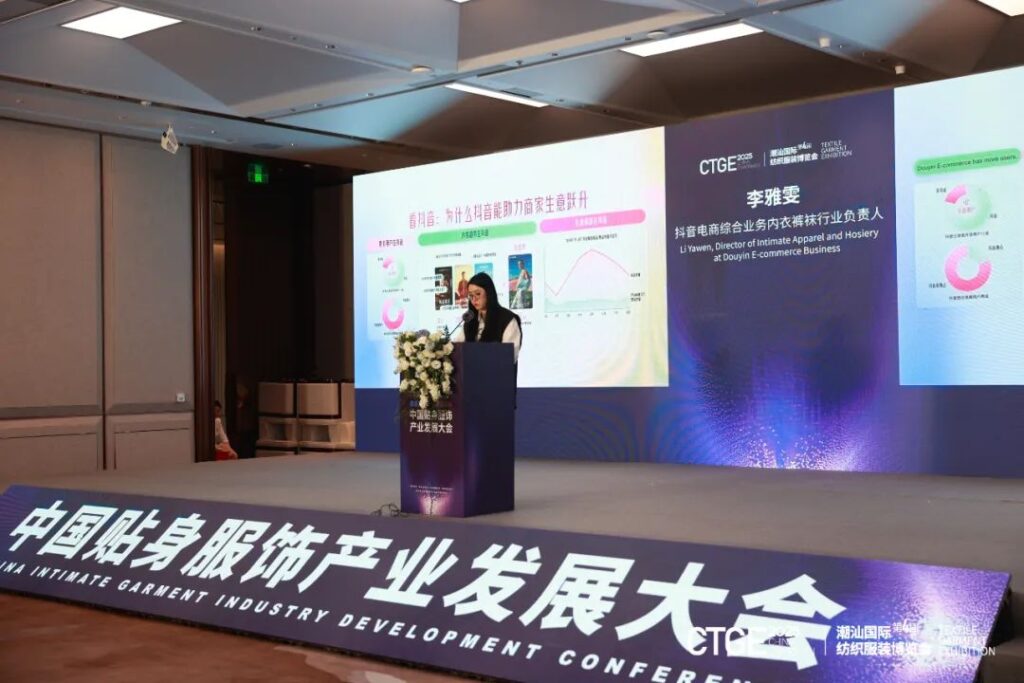 抖音电商综合业务内衣裤袜行业负责人李雅雯在大会上分享了2025抖音内衣趋势,表示汕头内衣产业带高速增长,2024年抖音电商内衣裤袜类目汕头产业带过亿品牌约20个,同比增长85%,指出线上生意靠内容电商驱动。