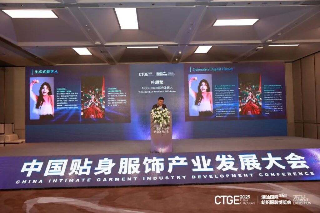 AIGCxPower联合发起人叶超莹现场演示AI驱动设计系统,展示“AI生成千款内衣设计”。他提出“AI+快反供应链”成为降本增效新模式,技术应让产业从“效率优先”转向“体验为王”。