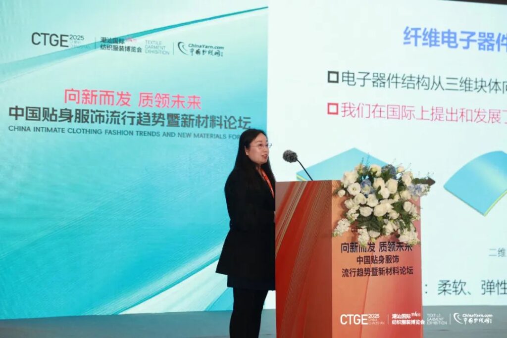江苏集萃先进纤维材料研究所副总经理周家良带来了 “多功能纤维材料及应用进展”的主题演讲,全面展示了多功能纤维材料的最新研发成果以及在贴身服饰领域的应用前景。据介绍,多功能纤维材料在强度、舒适性、功能性等方面具有显著优势,其广泛应用将推动贴身服饰产品向高性能、高品质方向迈进,助力行业实现高端化发展。