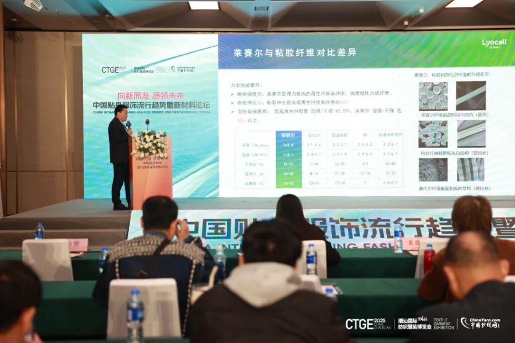 赛得利下游市场拓展经理杨哲以 “赛得利莱赛尔,智享绿色‘芯’时尚” 为主题,详细阐述了赛得利莱赛尔纤维的绿色环保特性、卓越性能以及在贴身服饰中的应用优势。他强调,随着消费者环保意识的不断提高,绿色纤维材料已成为行业发展的必然趋势。赛得利莱赛尔纤维凭借其可持续生产工艺和优良的产品性能,能够满足消费者对舒适、健康、环保的多重需求,为贴身服饰行业的绿色转型提供了有力支撑。