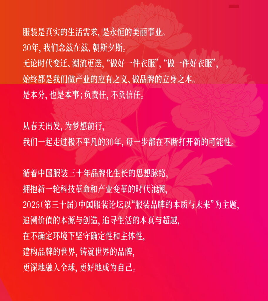 2025(第三十届)中国服装论坛,以“服装品牌的本质与未来”为主题,追溯价值的本源与创造,追寻生活的本真与超越,在不确定环境下坚守确定性和主体性,照见品牌的世界,构建世界的品牌,更深地融入全球,更好地成为自己。