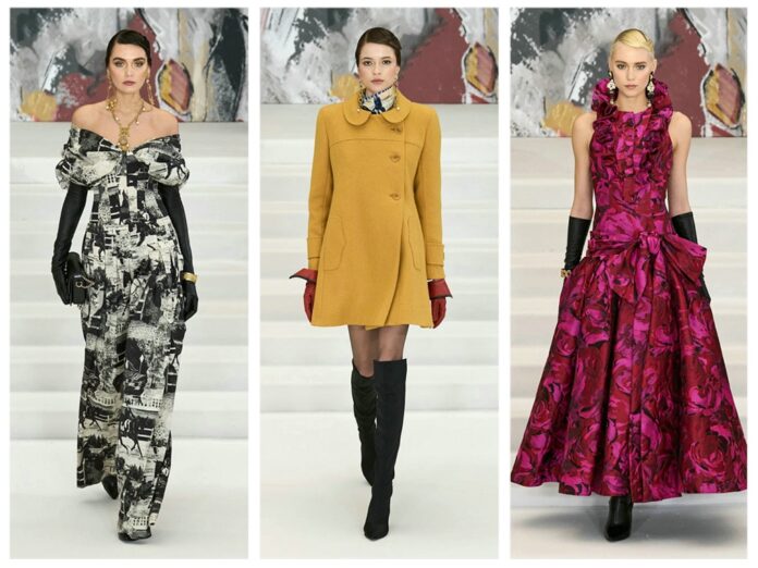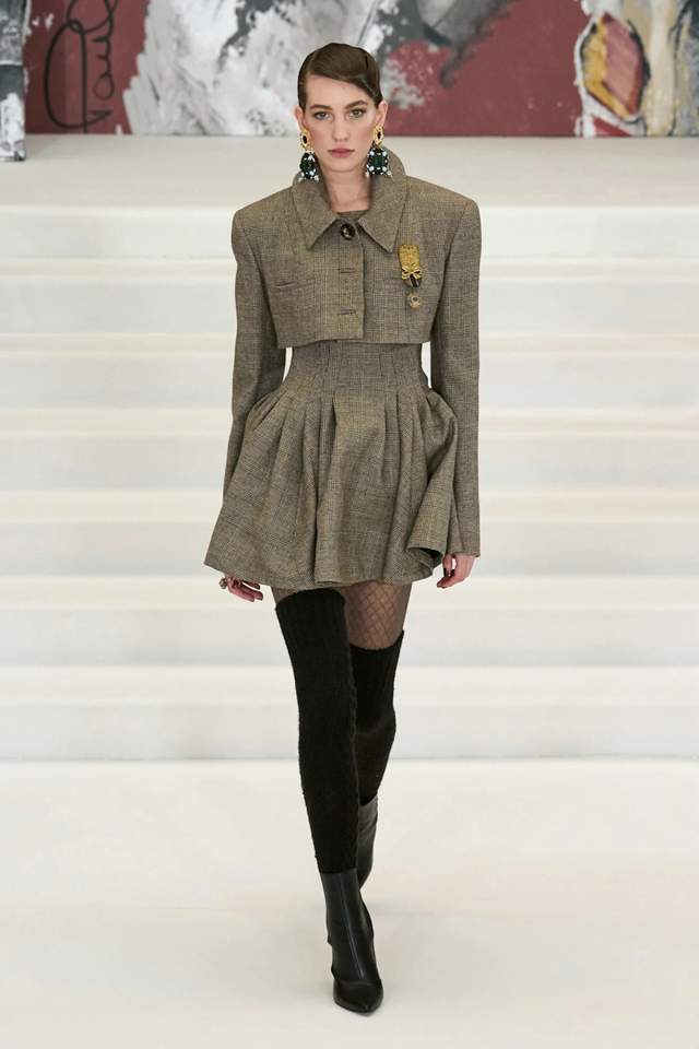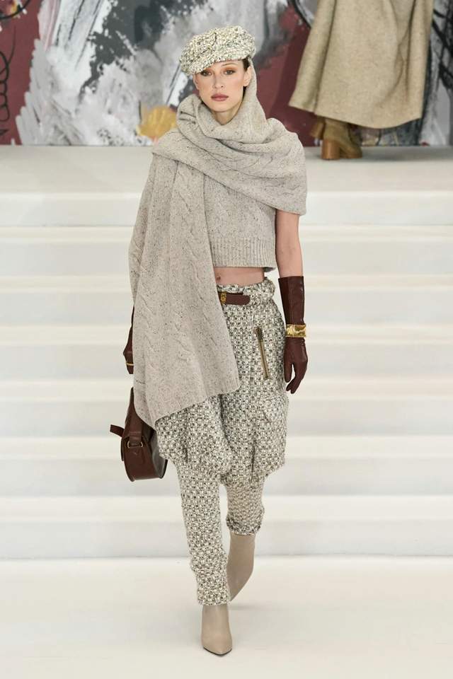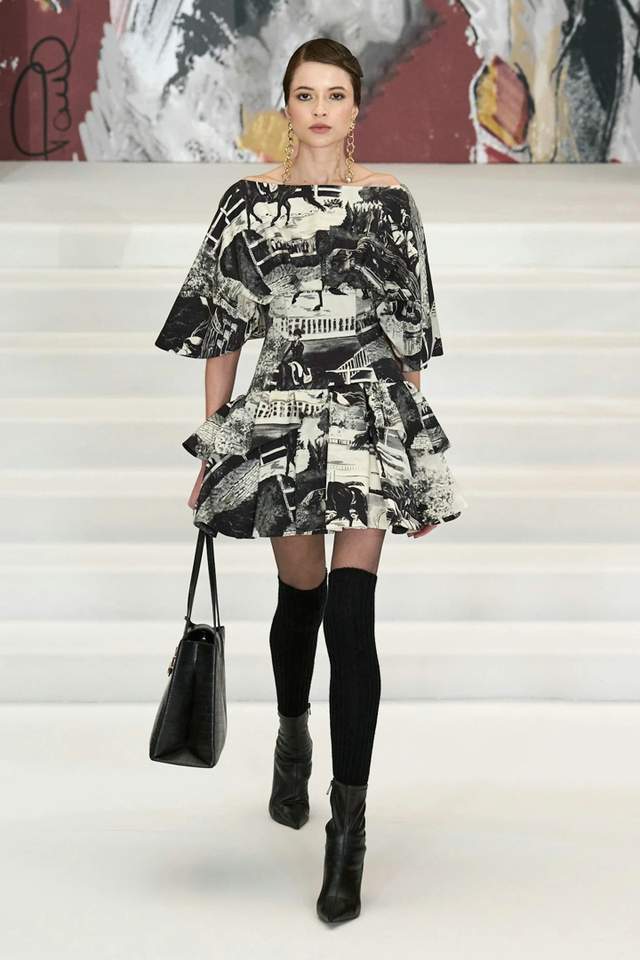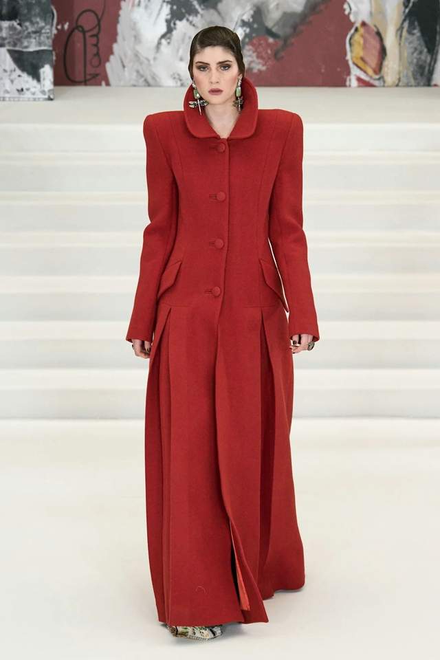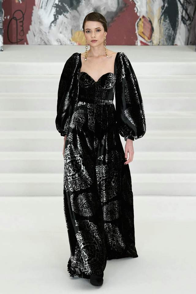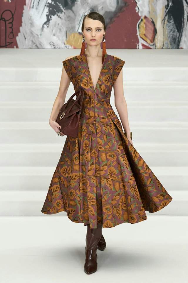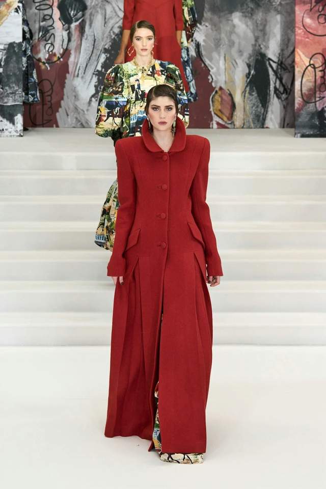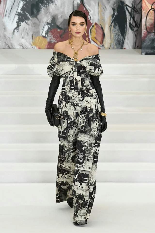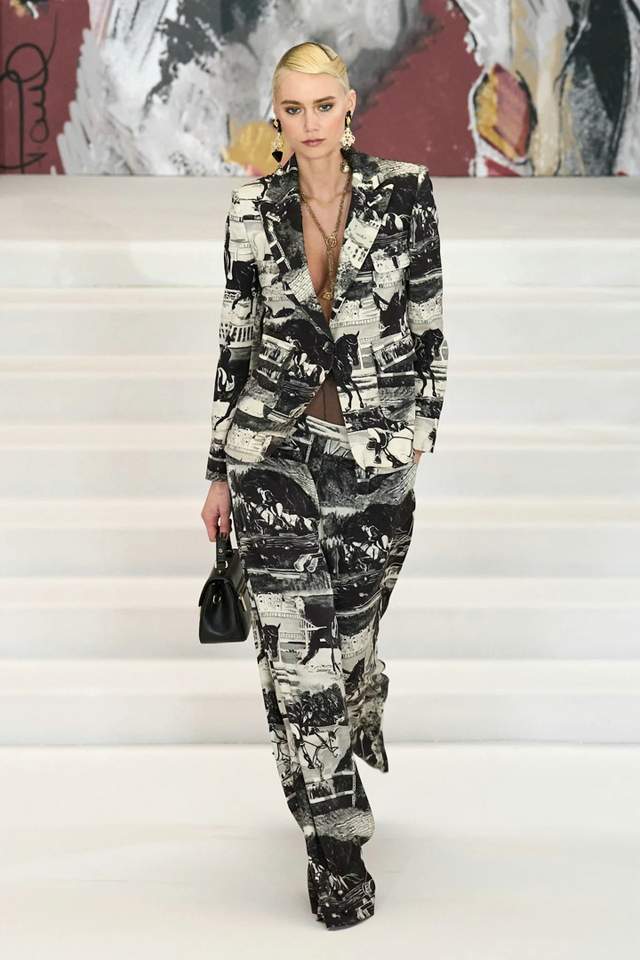 在Paul Costelloe 2025秋冬本季的系列中,Paul Costelloe选用了来自爱尔兰Magees和苏格兰Harris的奢华面料,结合其标志性的设计手法,打造出极具雕塑感的廓形与结构。设计师以其独特的绘画视角,深入探索了秋季色调的丰富层次:栗棕色、琥珀黄、冬日奶油色、浆果红与午夜黑交织,营造出温暖而深邃的氛围。印花作为Paul Costelloe系列的核心元素之一,本季再度成为亮点。设计师与其家族团队共同创作了一幅叙事性印花,生动描绘了现代马术世界的优雅与活力。