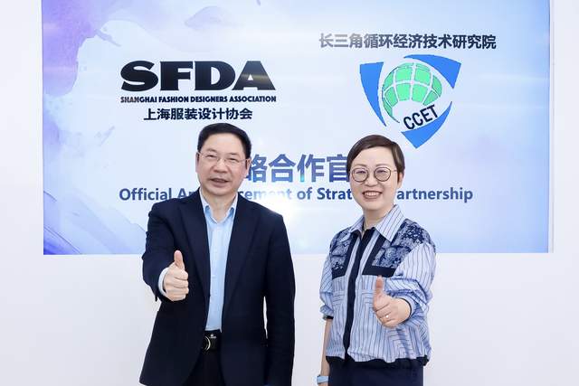 此外,他也介绍,“长三角循环经济技术研究院”已经与“上海服装设计协会”达成战略合作,以上海服装设计协会为核心载体,以长三角循环经济技术研究院的学术支持和技术创新为支撑,串联和打通时尚创意产业链资源,从创意人才培养、未来面料探索、绿色供应链生态体系搭建三方面着手,共同探索更多绿色时尚未来。主旨演讲的最后,上海服装设计协会会长王嵘与杜教授现场共同上台官宣了双方战略合作的达成。