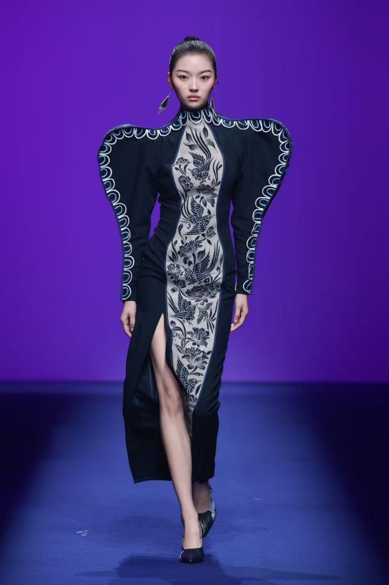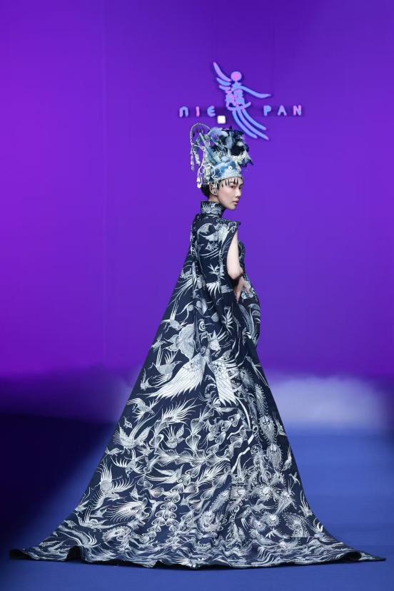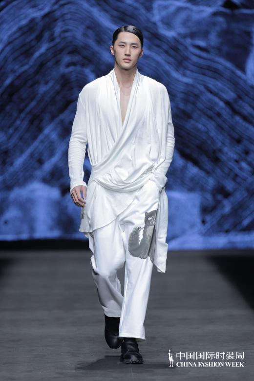 江西服装学院青年教师成昊以“涅槃”为主题的大秀,发布了干士品牌的新作品。成昊用八年深居苗岭的苦行,将苗族蜡染的古老技艺推向国际时尚舞台,让凤凰涅槃的传说在蓝白布帛上重生,自然形式里积淀的社会价值和美学内容得以具象。