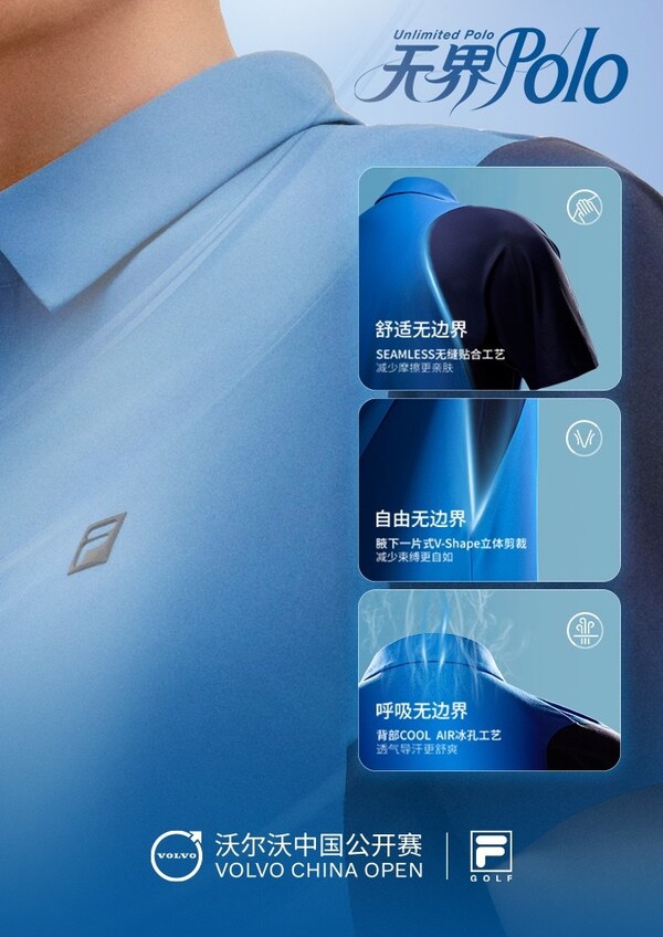 本届赛事中,FILA GOLF将继续为赛事提供专业科技装备,为所有官员、裁判、志愿者提供专属定制赛事战袍,用高性能服装为赛事人员带来优质穿着体验。核心赛事赞助服装无界POLO以”无界科技”自成焦点,FILA GOLF品牌形象代言人许龙一与新星菁英团球员陈子豪将身穿定制无界POLO闪耀沃尔沃中国公开赛赛场,展现专业竞技表现。该系列采用先进的SEAMLESS无缝贴合工艺,有效减少摩擦,带来更亲肤的舒适体验;腋下一片式V-Shape立体剪裁设计,让每一次挥杆都更加自如流畅;背部的COOL AIR冰孔工艺实现全天候透气控温,显著增强透气导汗性能,助力运动员在赛场上发挥出绝佳竞技水平。无界POLO深化了”舒适无边界”、”自由无边界”、”呼吸无边界”的三重无界版型科技,一件POLO掌控多元主场,传递赛事”无界破局,高手上场”主张,以专业科技重构运动叙事,护航球员赛场竞技,助力赛事全面升级。
