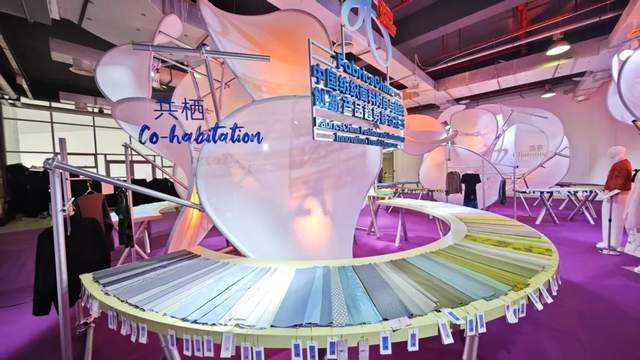 展区以“融通”为核心概念,通过对生活方式和消费理念的动态变化进行全方位解读,将500余款来自中国国际面料设计大赛以及中国时尚面料设计大赛入围企业的优秀面料,按照材质、色彩、图案、功能等特点分别呈现于“共栖”“循意”“漫游”和“交响”四个主题区域中,深度诠释了2026春夏科技和功能性面料的设计和应用方向,展现了国内纺织面料开发的领先水平。
