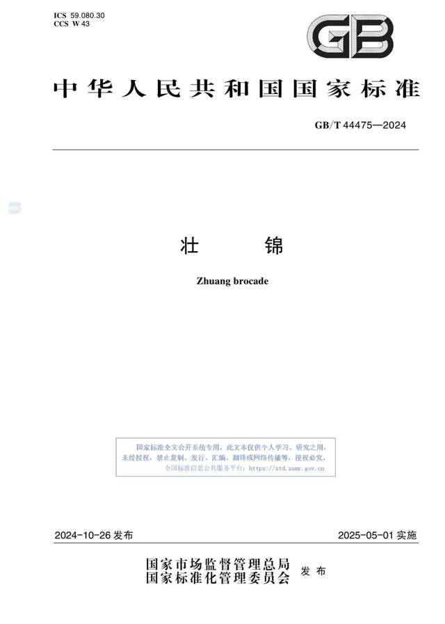 壮锦国标起草小组一边动之以情晓之以理,一边再次调研广东、云南等地壮锦,对相关内容进行完善。2024年10月26日,壮锦国标终于通过批准发布。据介绍,国标不仅对壮锦的术语、定义、试验方法、检验规则、适用范围等进行了明确规定,还首次从国家层面阐明壮锦工艺,统一其质量与安全标准,为壮锦的数字化保护、产业化发展奠定了基础,推动非遗技艺从“手口相传”迈向科学化传承。