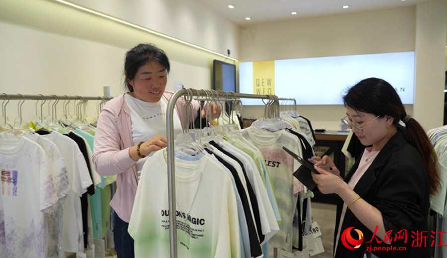 人民网讯 熨烫、挂牌、折叠、打包……眼下正值夏装上新,在浙江省湖州市织里镇“千而万”童装店,廖维楼和员工们忙得不亦乐乎:“这批T恤是在安徽望江生产的,昨晚才到货,马上要发给客户。”