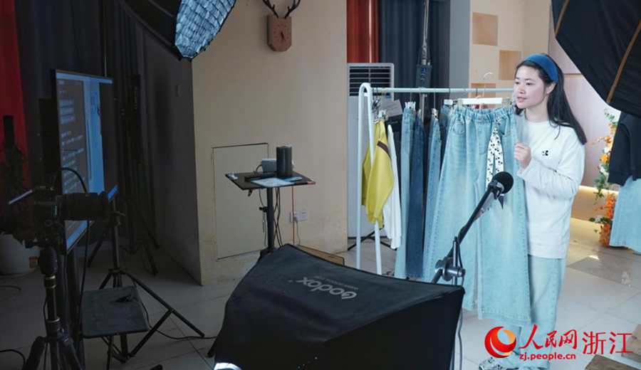 望江县一家电商正在直播卖服装。人民网 陈若天摄