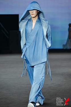 仿牛仔色系的面料,搭配分片剪裁、防水材质等工艺,再加上宽袖、束腰等武侠元素的融入,让服饰充满了时尚与实用性。模特们迈着轻盈的步伐,仿佛在诉说着旅途中的故事,让观众们感受到了汉文化在现代出行中的独特魅力。