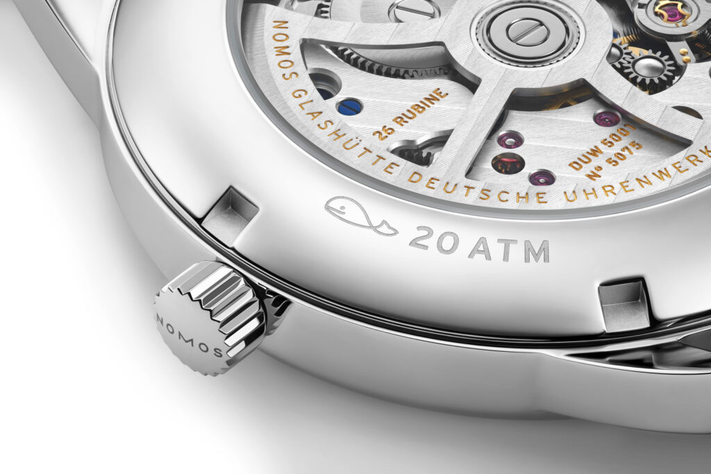 这款腕表由 DUW 5001 自动上链机芯驱动,搭载 NOMOS 自制擒纵系统,确保走时精准可靠。透过蓝宝石水晶透明底盖,可一览机芯的精美细节。表盘设计别致,巧妙融合了阿拉伯数字和罗马数字时标,并搭配黑色秒针盘及优雅的玫瑰金色指针。直径为 41.5 毫米,厚度不足 10 毫米,既彰显了手表的醒目外观又兼顾佩戴舒适度。