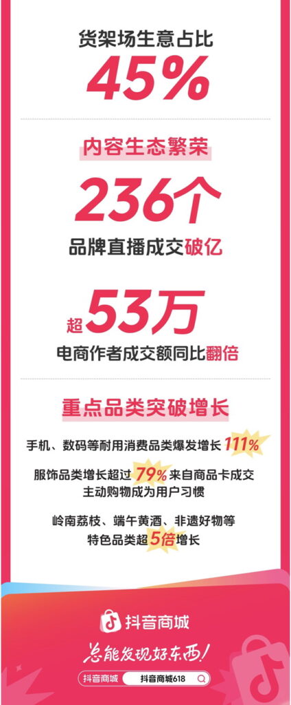 今年618,抖音电商全域增长势能全面释放。数据显示,抖音商城GMV同比增长77%,搜索GMV同比提升56%,货架场生意占比超45%,成为品牌增量核心阵地;优质内容拉动交易爆发,236个品牌直播成交破亿,超53万电商作者成交额同比翻倍。