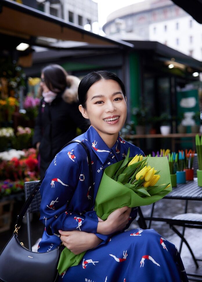 演员胡杏儿身穿Bally 2024 春夏女士海蓝色印花衬衫和半身裙,搭配Emblem Ellipse 黑色单肩包出镜街拍,以简雅轮廓搭配亮眼色彩,诠释知性气质。