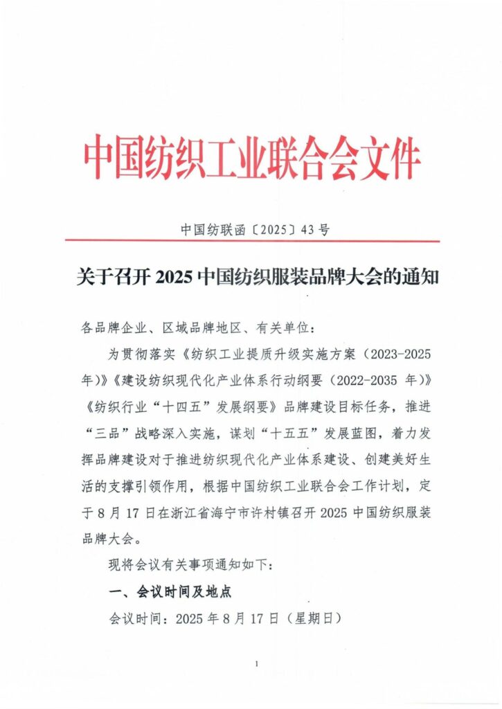 为贯彻落实《纺织工业提质升级实施方案(2023-2025年)》《建设纺织现代化产业体系行动纲要(2022-2035年)》《纺织行业“十四五”发展纲要》品牌建设目标任务,推进“三品”战略深入实施,谋划“十五五”发展蓝图,着力发挥品牌建设对于推进纺织现代化产业体系建设、创建美好生活的支撑引领作用,根据中国纺织工业联合会工作计划,定于8月17日在浙江省海宁市许村镇召开2025中国纺织服装品牌大会。