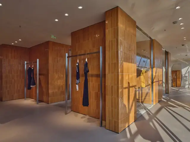温润的手工陶土地砖承托脚下步履,天顶白玉纹理如水如波,神人面纹浮雕在壁间若隐若现,清新茶香漫溢在空气中,古琴韵律与现代节拍碰撞出奇妙的音律……这间古韵与时尚交融的典雅空间,正是植根于天门服装电商产业基地的“天门衣尚”品牌馆一座用当代美学语言解读时尚产业的新地标。