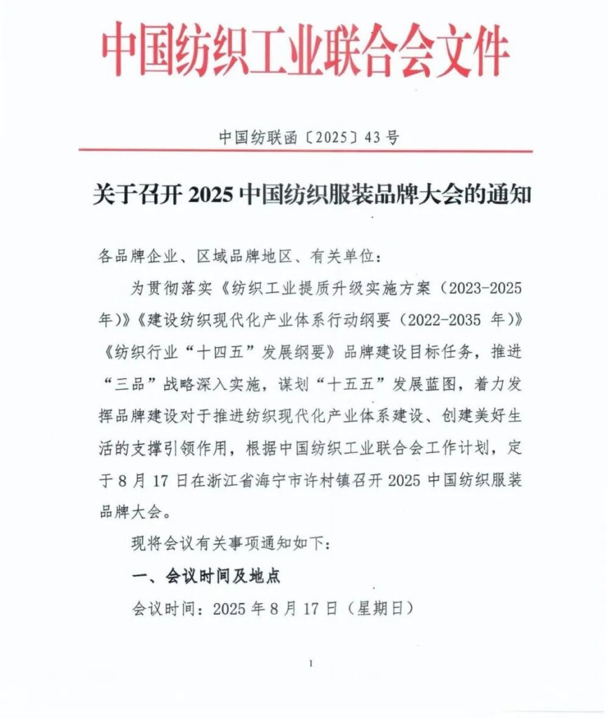 以“锦绣东方 品牌向上”为主题的2025中国纺织服装品牌大会定于8月17日在海宁许村召开,这场大会绝非简单的行业聚会,而是纺织产业响应国家战略、直面发展诉求,以品牌为刃攻坚现代化升级的重要行动。其背后,是纺织工业在政策指引、产业转型与消费迭代多重驱动下,对高质量发展路径的深度探寻。