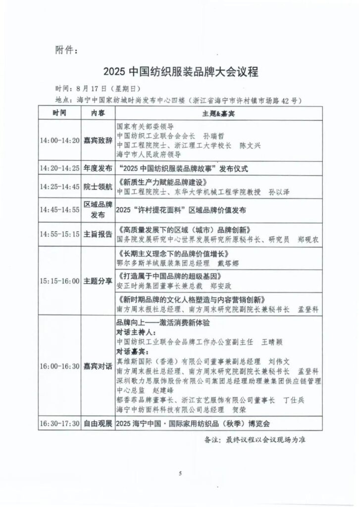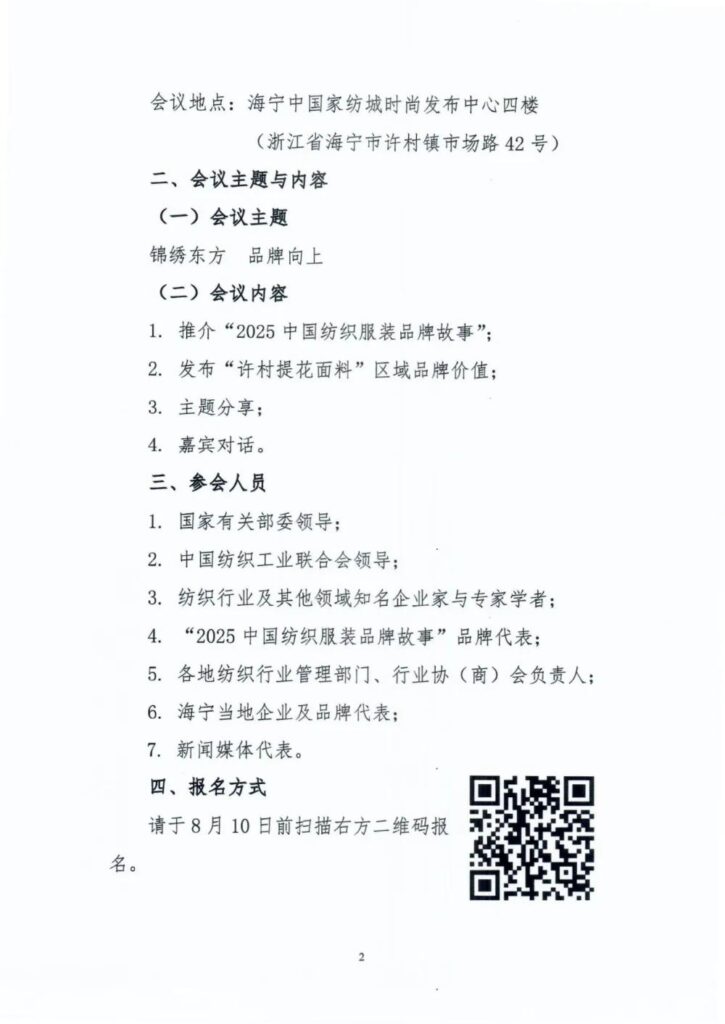 当纺织产业站在“十五五”开局与现代化转型的交汇点,2025中国纺织服装品牌大会的意义已超越一场会议——它是产业向品牌要动力、向创新要未来的宣言,是纺织人以品牌为笔,绘就现代化产业蓝图的起点。8月的海宁,将汇聚行业智慧,解码品牌密码,为纺织服装产业高质量发展注入澎湃动能,让“中国纺织服装品牌”成为产业升级最鲜明的标识。