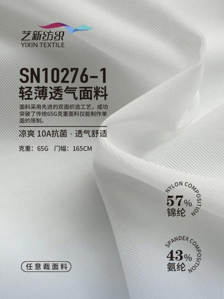 SN10276-1面料采用先进的双面织造工艺,成功突破了传统65g克重面料仅能制作单面的限制。通过优化织造结构,巧妙使用10D超细锦纶,不仅保留了面料的轻薄透气特性,还赋予其独特的凉感。