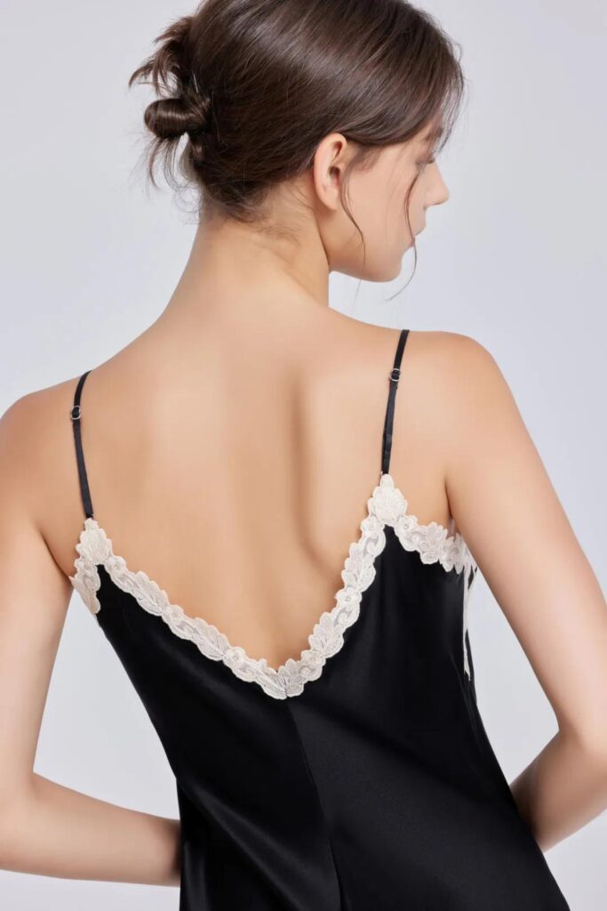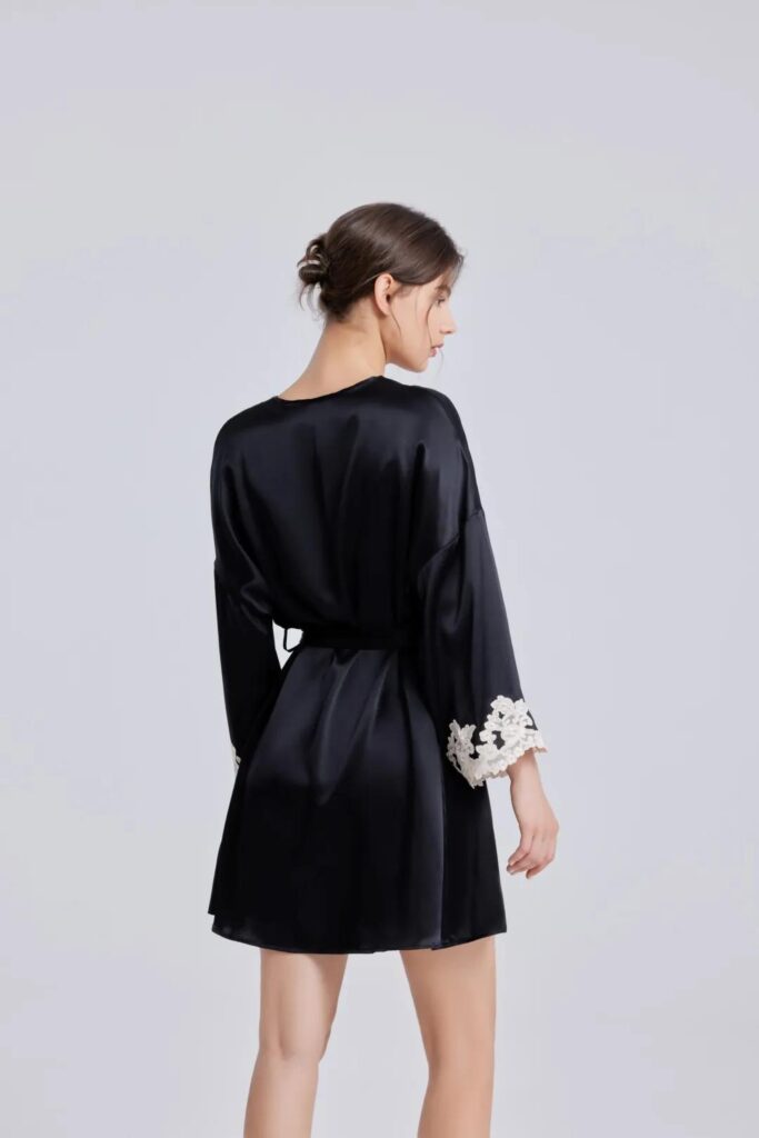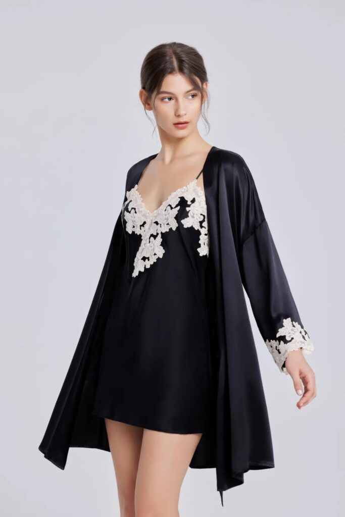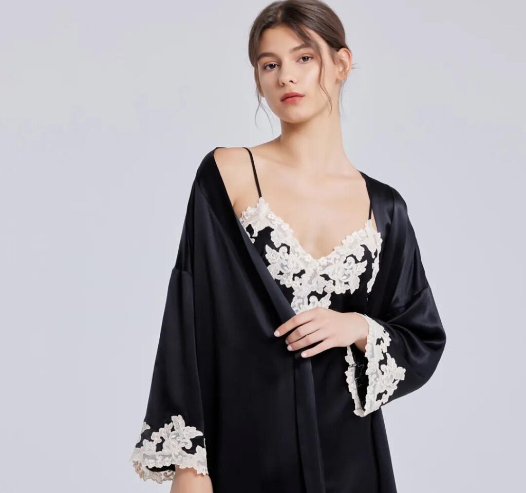 可拆卸内衬的黑色刺绣真丝套装,内衬采用22姆米整死,外层面料通过植物染料染色。用户反馈其既能作为睡衣,也可外搭腰带出席家庭聚会,兼顾环保与实用价值。