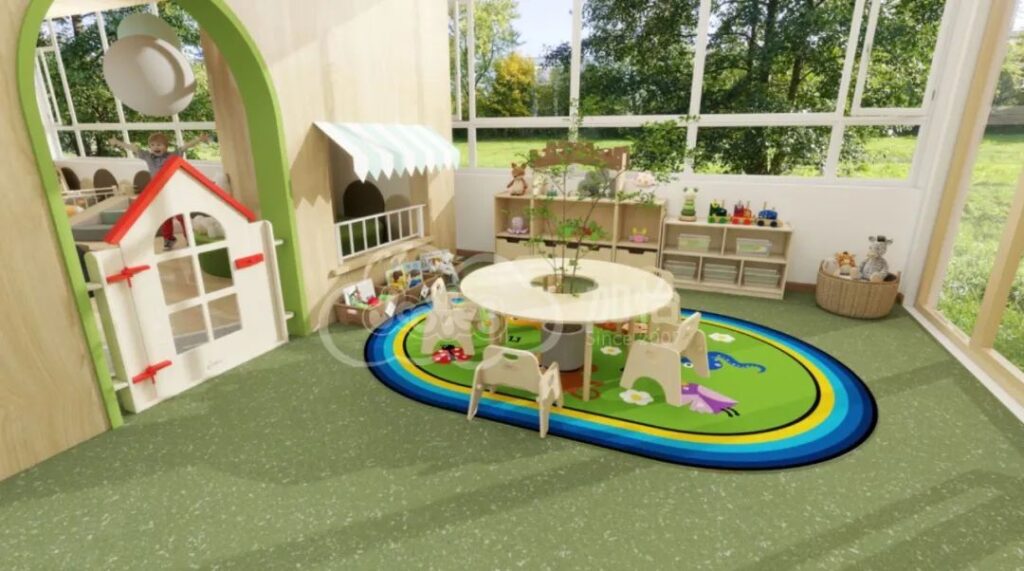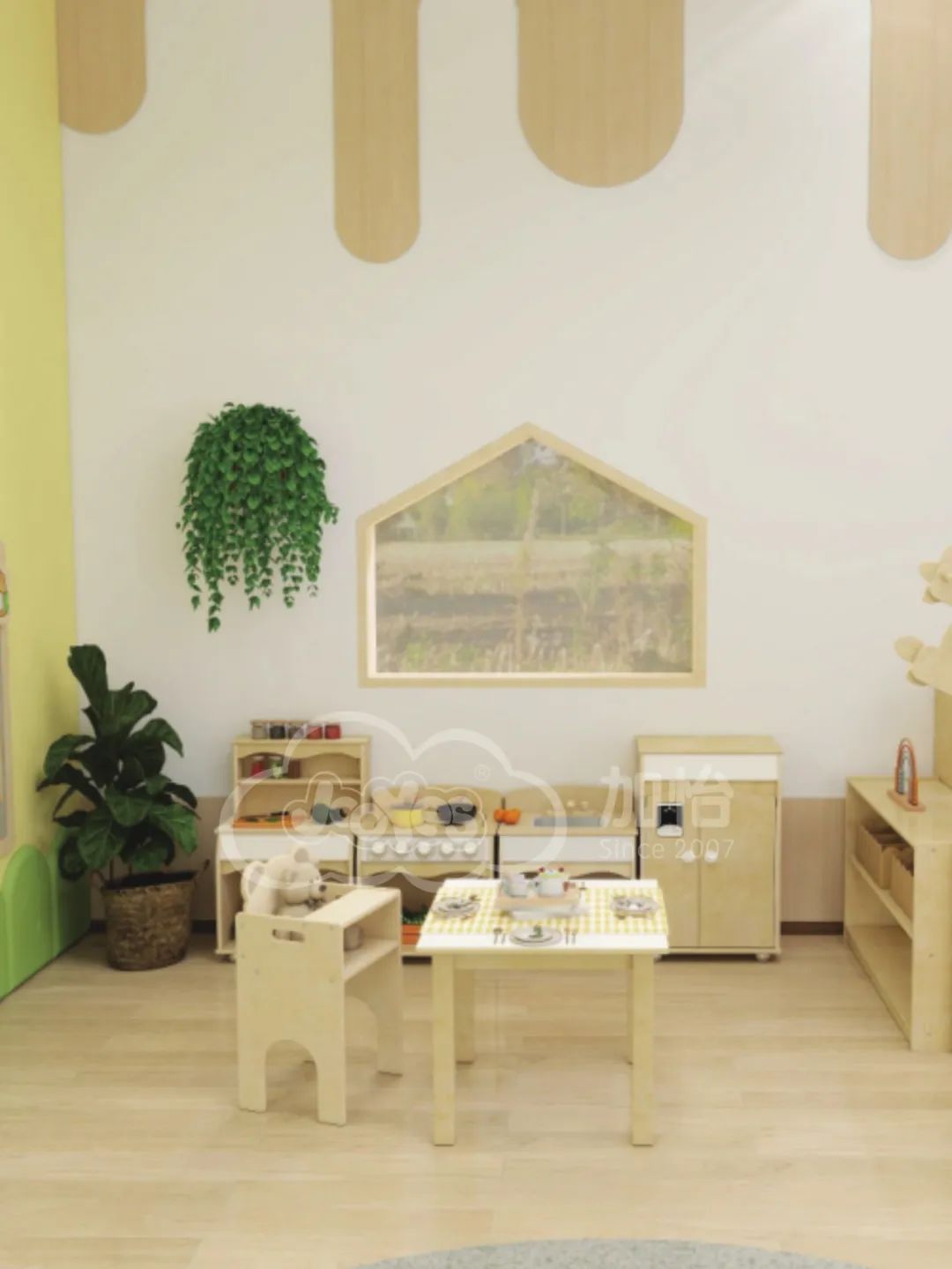 利用教室中一片木制小屋造型的空置区域,JOOYES加怡为0-3岁宝宝提供多样化高质量托育家具,打造适配托育教室的学步区、运动区等活动区角,为宝宝创设安心舒适美观的一日活动环境。