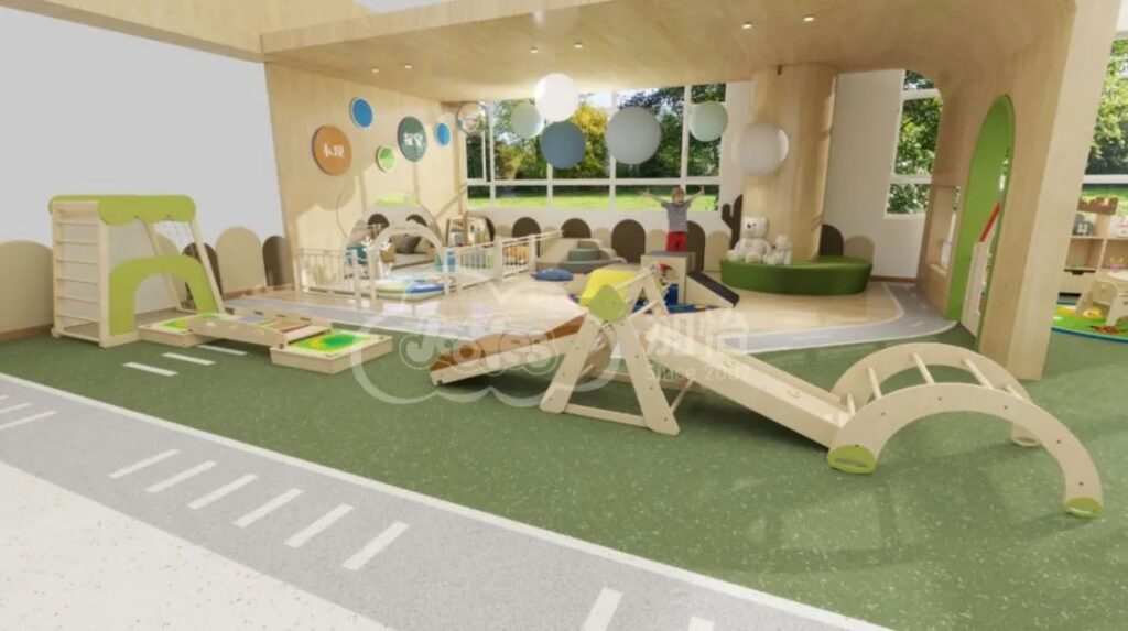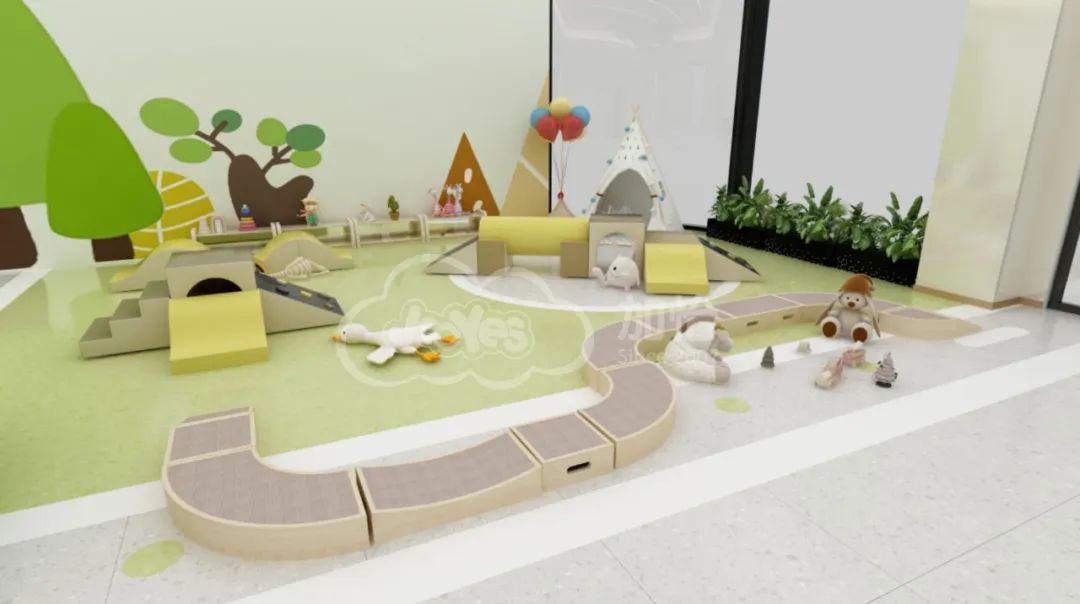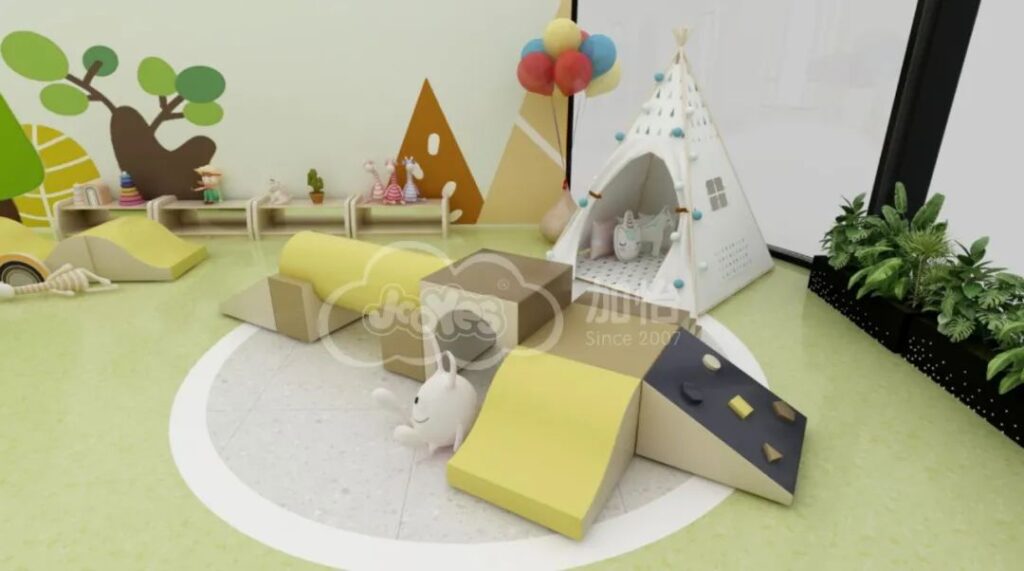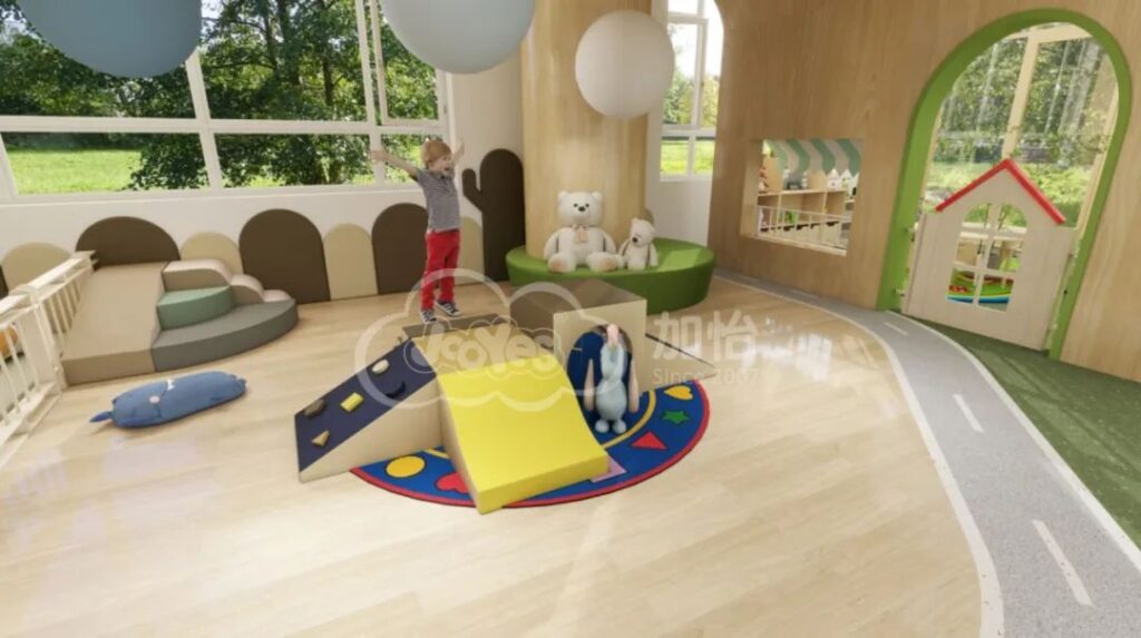 粗大动作发展对于婴幼儿至关重要,运动能力的发展有助于提升幼儿的自我认知与大脑发育。JOOYES加怡为幼儿打造托育大肌肉活动区,整体选取森系环境风格,软包都可定制颜色,设置幼儿可轻松触及的、高度低矮的地面活动区,以供幼儿练习攀爬和学步行走。
