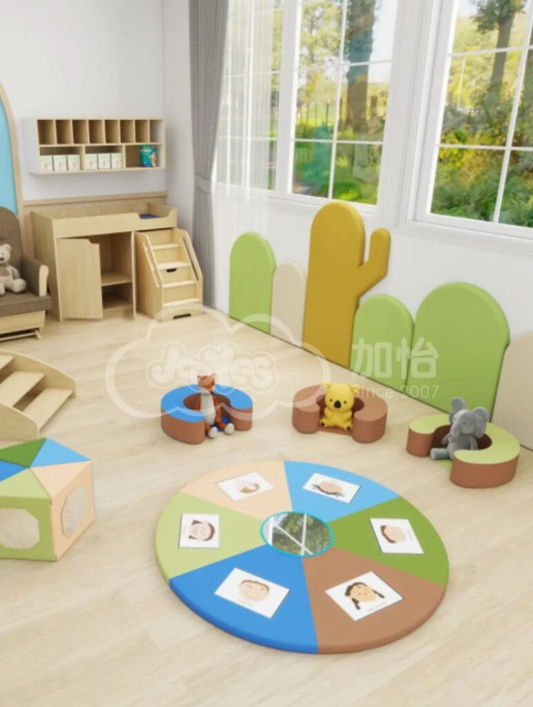 在托育教室,地面活动区支持幼儿在安全、自由的环境中自主探索,刺激感官、运动发展、建立早期空间感与认知。JOOYES加怡为幼儿打造舒适开放的托育地面游戏活动区,整体选用蓝色调,墙面铺陈仙人掌软包,防撞安全保护。投放多样功能区块,幼儿通过丰富的游戏与活动,在与环境产生的互动中成长与发展。