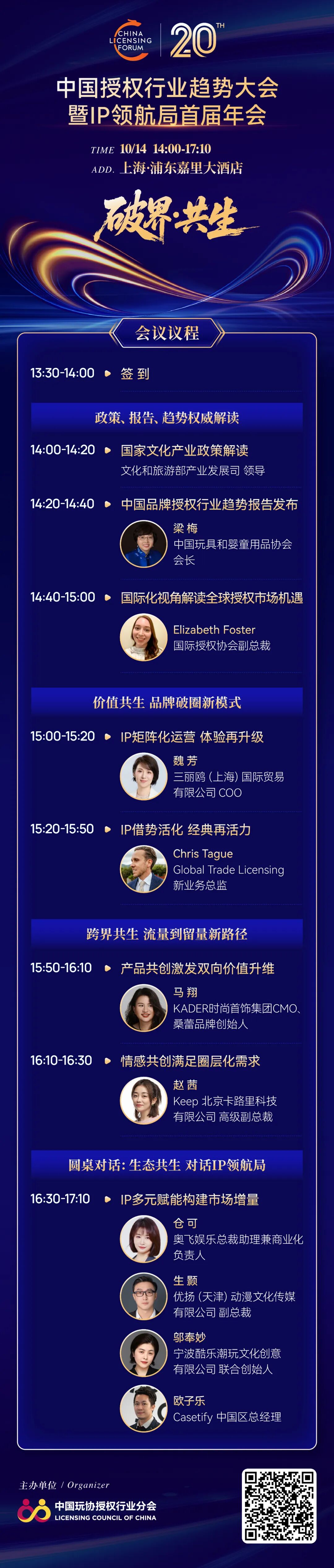 第 20 届 中国授权行业趋势大会在文化和旅游部产业发展司的关心和指导下,以“破境·共生”为主题,汇聚 12 位活跃于授权行业的海内外资深专家和企业高层,分别从国内外政策、趋势的宏观视角到 IP 赋能全域新模式的聚焦视角打开研讨路径,呈现其不同的独家见解和经验分享,为中国授权行业发展提供更具前瞻性和专业性的引导和剖析,助力 IP 打破边界,共生共荣。