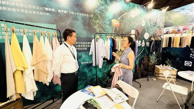 中国服装设计师协会顾问黄萍在恒碳科技展位交流