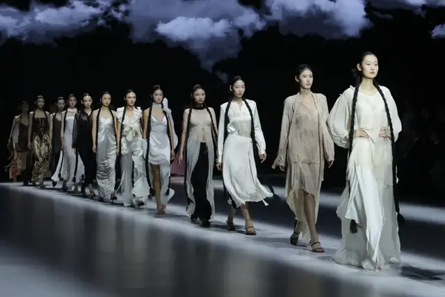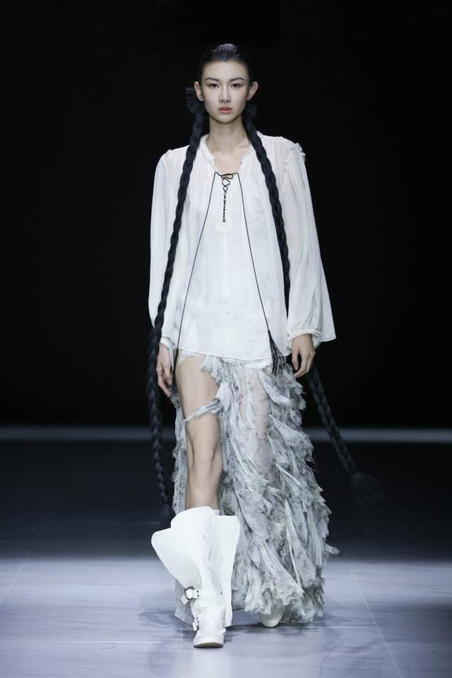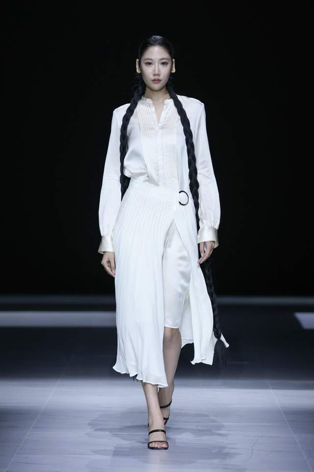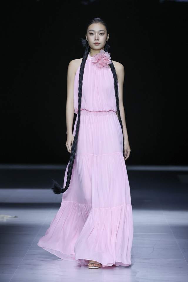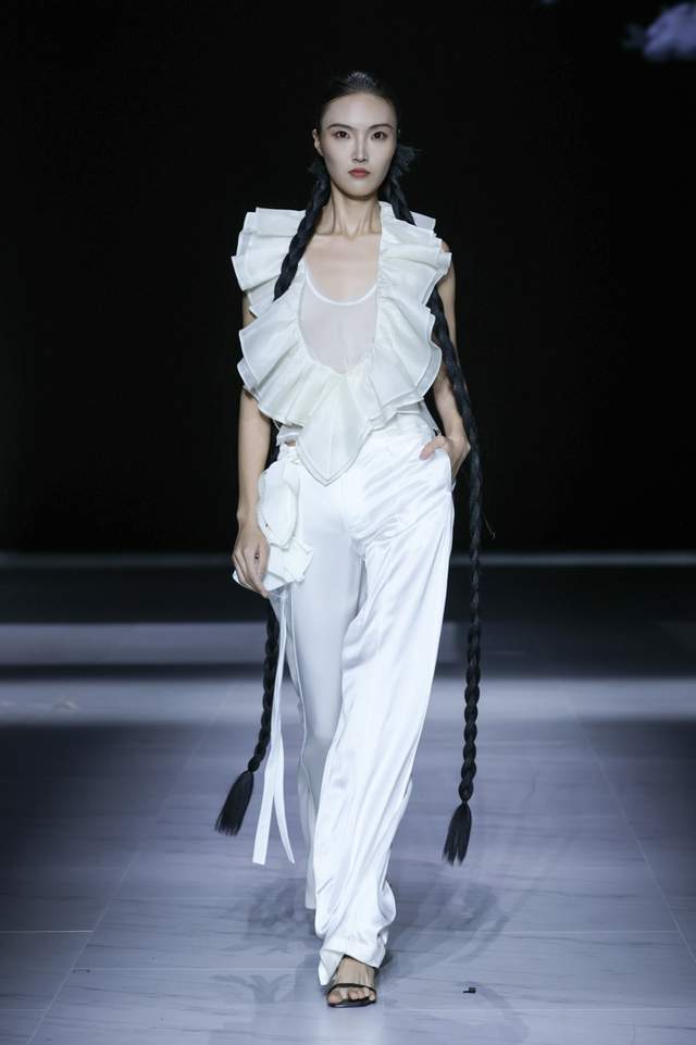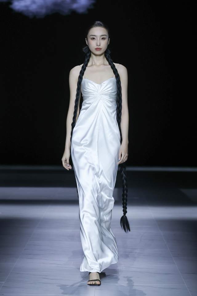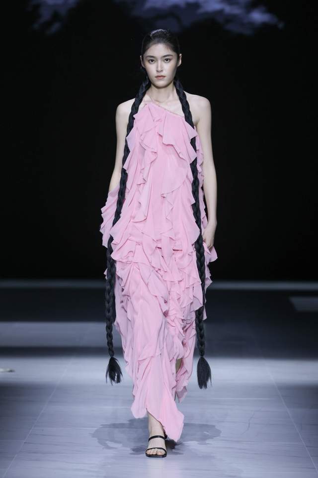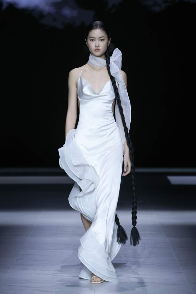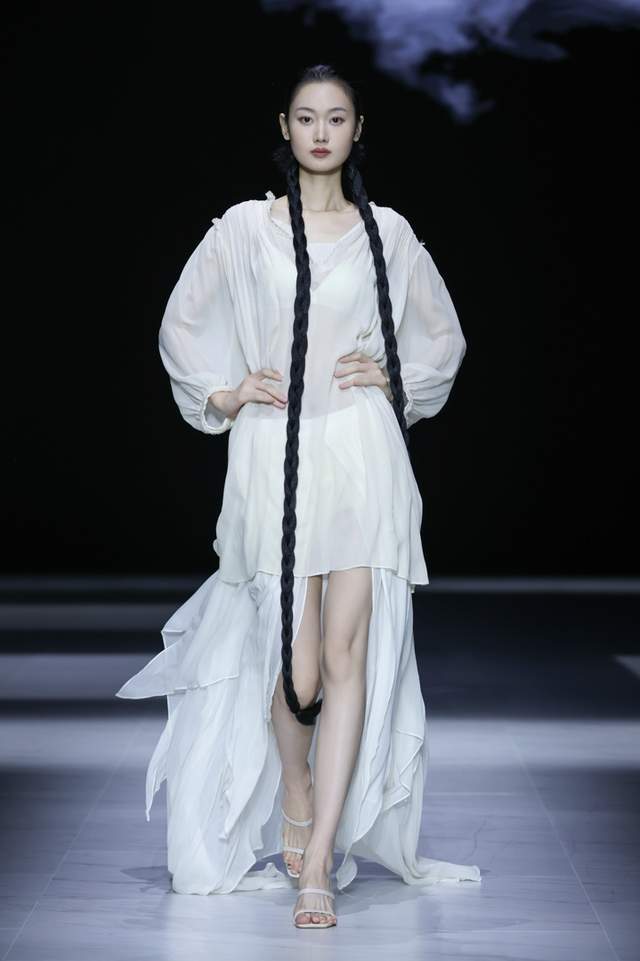 设计师采用斜裁与细密压褶并用,形成流动垂坠与行走褶影,以手工撕条与羽化生边,营造“藻羽/花序”般层层坠片,以卷边、窄包条及法式包缝处理,极好地保证了轻薄面料的整洁与强度。