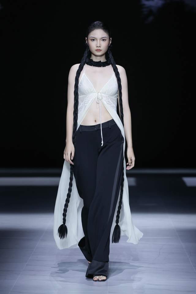 植序、身体与衣料,在流动中彼此生成。“共生”以自然肌理为谱,轻纱如海雾,手撕垂缕似礁岸藻羽,褶裥与斜裁让行走成为风的雕刻。半透与缎面并置,随机与秩序互为平衡,营造像生态系统般自我调和的韵律。