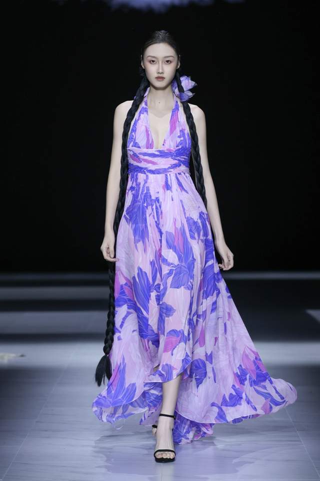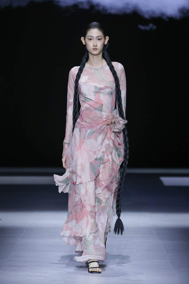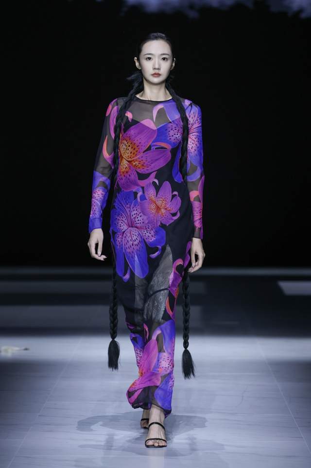 本季发布,桑罗SANGLUO品牌主要选用优质素绉缎、雪纺、乔其纱进行多层叠合,局部采用数码花型直喷与定位裁片技艺。