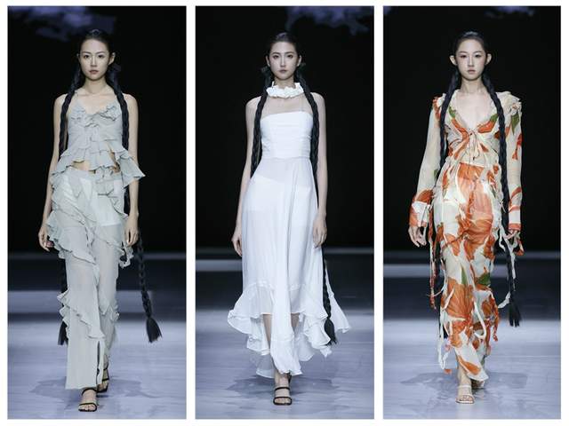 本季发布,桑罗SANGLUO品牌主要选用优质素绉缎、雪纺、乔其纱进行多层叠合,局部采用数码花型直喷与定位裁片技艺。