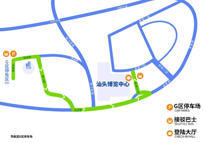 *组委会将在展会期间安排【G区停车场⇔汕头博览中心】接驳车,坐满即走,请您到达后留意组委会接驳告示牌。