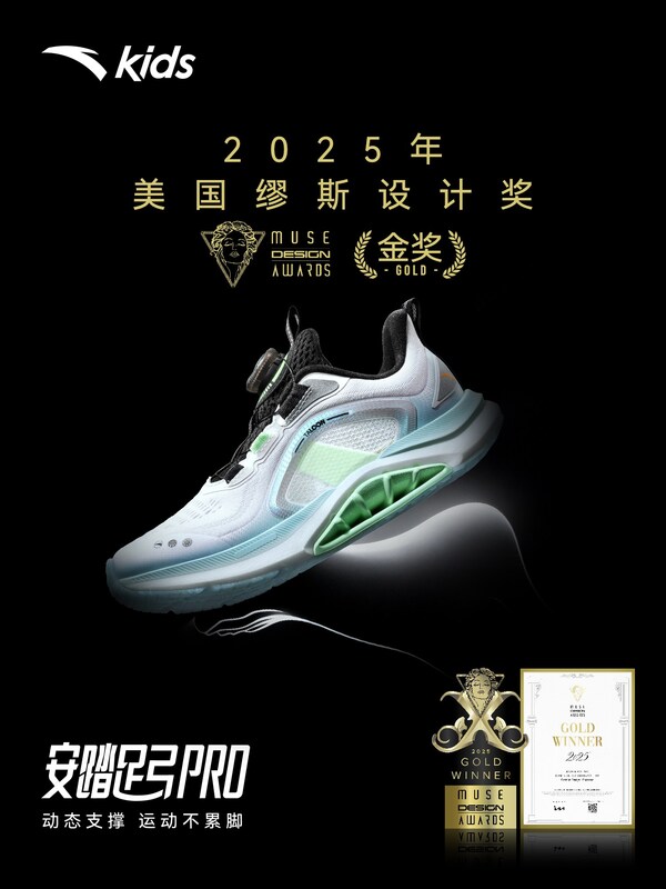 厦门2025年10月20日 /美通社/ — 安踏儿童旗下产品”足弓PRO跑鞋”凭借对儿童足弓健康成长的深刻洞察与科学的产品设计,荣获2025年缪斯设计奖(MUSE Design Awards)金奖。该奖项作为国际设计领域的权威奖项之一,被誉为全球设计领域的风向标,旨在表彰具有创新性的卓越设计。此次获奖,标志着中国品牌在儿童健康科技产品领域的设计实力获得了国际认可,也体现了中国品牌以科技创新助力儿童健康公共健康议题解决的不懈努力。