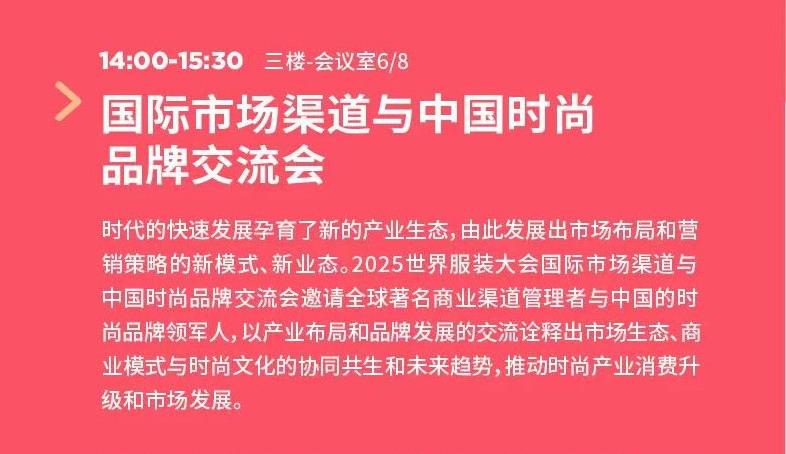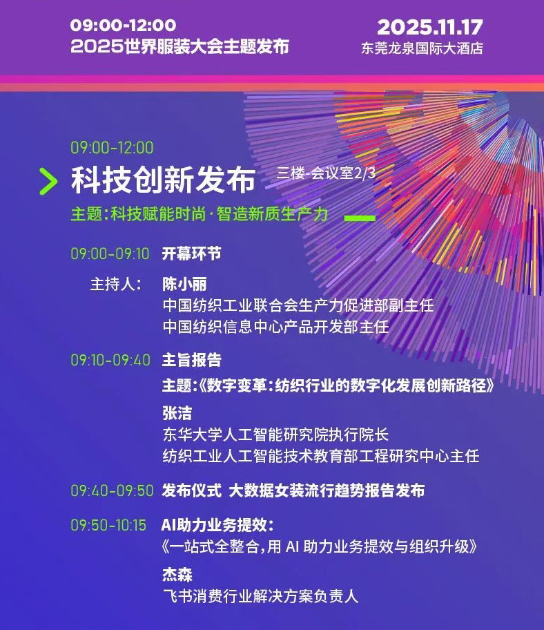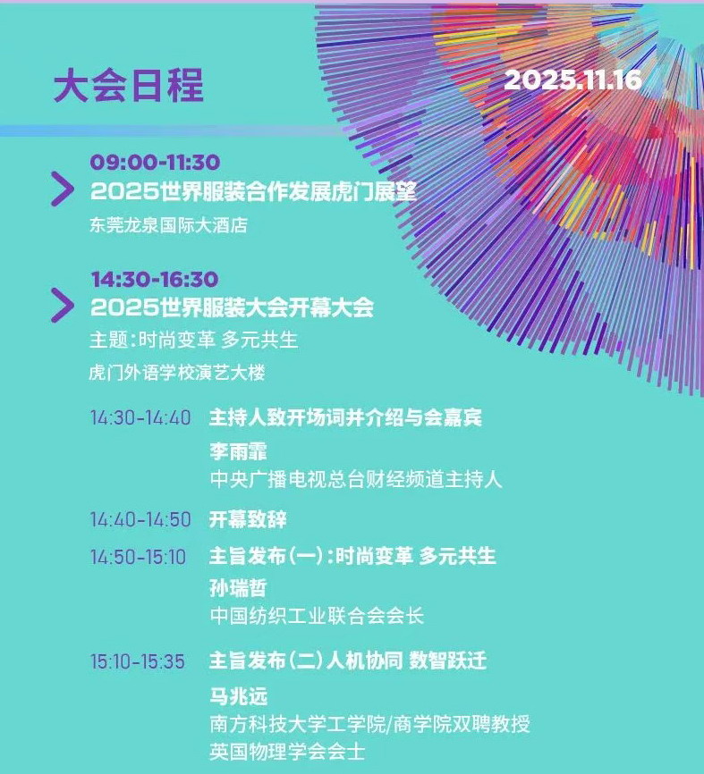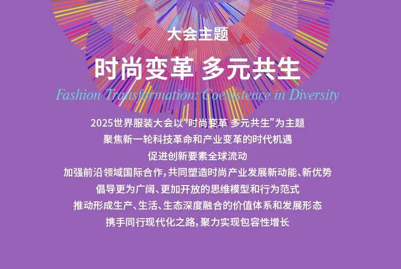 围绕“时尚变革 多元共生”主题,2025世界服装大会将于11月16—17日在广东省东莞市虎门镇举办。大会由中国纺织工业联合会主办,广东虎门富民集团有限公司联合主办,中国服装协会、中国纺织信息中心承办,中国纺织工业联合会社会责任办公室、纺织产品开发中心、东莞市虎门服装服饰行业协会协办。