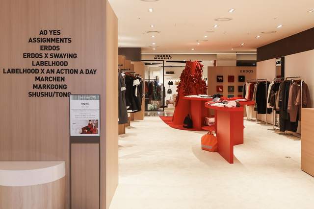 快闪空间以蕾虎标志性的红为主视觉,营造出一个舞台式零售场景,让首尔的消费者近距离体验中国设计作品中的细节、工艺与情绪表达,感受蕾虎社区所代表的年轻创意能量。本次参展品牌阵容包括 设计师品牌AO YES凹是、ASSIGNMENTS、an action a day蕾虎联名系列、MARCHEN、MARKGONG、SHUSHU/TONG,以及中国高端羊绒时装品牌 ERDOS 主线系列与 ERDOS × swaying/knit 联名系列。展场墙面装置灵感来自 ERDOS 延续十二年的生肖系列,呈现羊绒针织在东西方文化碰撞中的多元形态与设计张力。