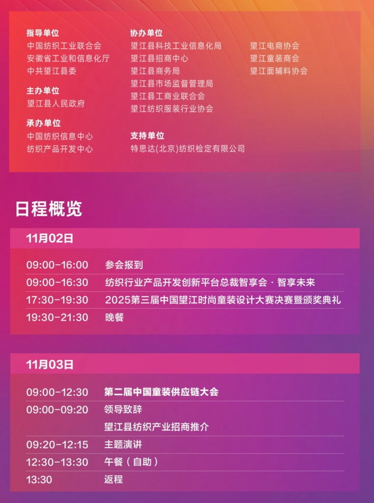 这份对产业革新升级的期待,将于11月3日汇聚2025全球纺织服装供应链大会暨中国望江童装供应链大会。这场在安徽望江举行的盛会,不仅将回应当下“安全、绿色、个性化”的童装消费趋势,更将为童装供应链搭建起思想碰撞、资源对接的核心平台,为童装人带来一场兼具趋势洞察与实践价值的产业盛宴。