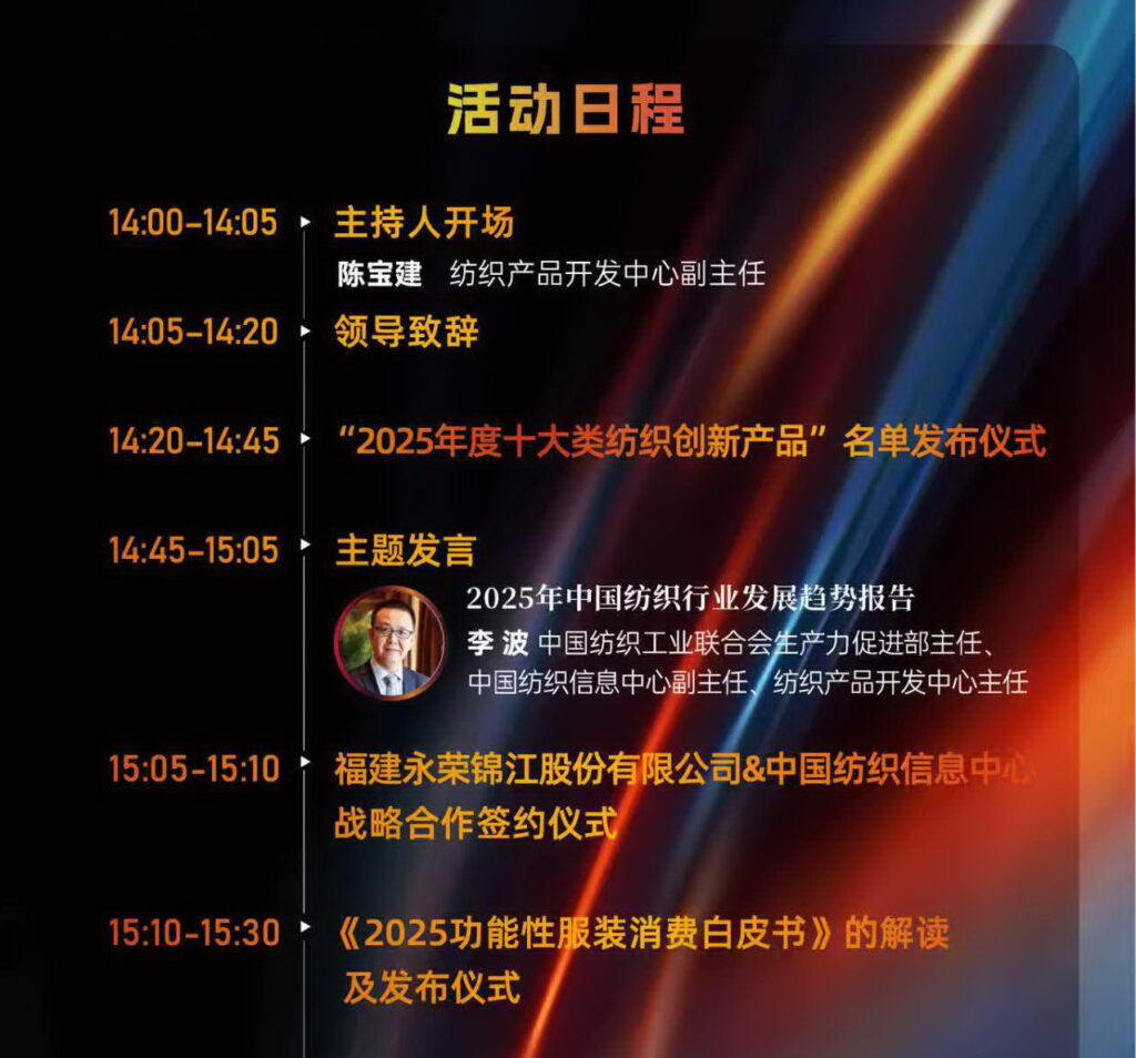 本次大会不仅是“思想碰撞场”,更是“价值转化台”,将通过多个环节推动创新从纸上构想变为产业实效。“2025年度十大类纺织创新产品”名单发布仪式将集中发布中国纺织行业在产品研发领域的优秀成果,为行业树立创新标杆。福建永荣锦江股份有限公司与中国纺织信息中心将达成战略合作,发挥双方的技术优势、平台优势与资源优势,加速推动锦纶创新产品的多元化开发与应用。《2025功能性服装消费白皮书》也将在会上发布,通过系统解析功能消费需求变化、技术应用现状及未来趋势,为企业制定研发策略提供数据支撑。此外,百家服装品牌与柯桥面料企业对接会将搭建供需交流与合作桥梁,推动推动产品开发与市场需求的精准匹配。
