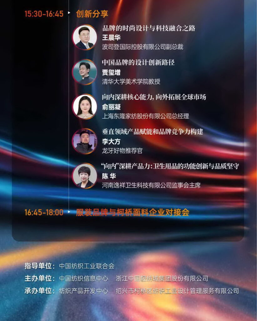 在趋势层面,中国纺织工业联合会、中国纺织信息中心的专家将解读行业发展方向与消费市场变化,帮助企业精准把握功能性、品质化、环保性等开发新趋势。在设计与研发层面,来自清华大学美术学院、波司登、逸祥卫生科技的嘉宾,将聚焦时尚设计路径、功能性产品开发等关键话题,为企业提供可落地、能复制的创新方案;在品牌与市场层面,来自龙牙、东隆家纺的嘉宾,将深入探讨垂直领域产品赋能策略以及全球市场布局方向,助力行业企业打造细分领域标杆,在本土化深耕与全球化拓展的并行中实现转型突破。