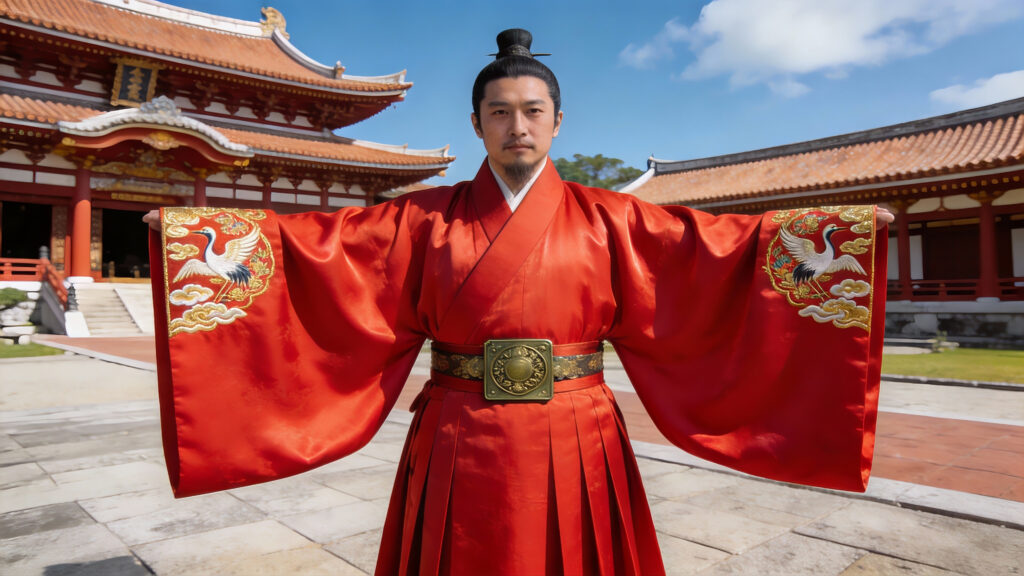 14 世纪琉球王朝建立,开启了琉装的成型之路,而来自明朝的赐衣制度,为其注入了核心文化灵魂。彼时,琉球作为中国藩属国,与中原王朝保持着密切的朝贡往来,官服体系严格遵循中原服饰的右衽交领制,贵族腰带处镶嵌明朝赏赐的铜牌,既是身份的标识,也是藩属关系的见证。1429 年《中山世鉴》明确记载,尚巴志王统一琉球群岛后,下令出使中原的使节必须 “衣冠如华风”,以此彰显对中原文化的认同,这一规定也推动琉装官服体系走向规范化。