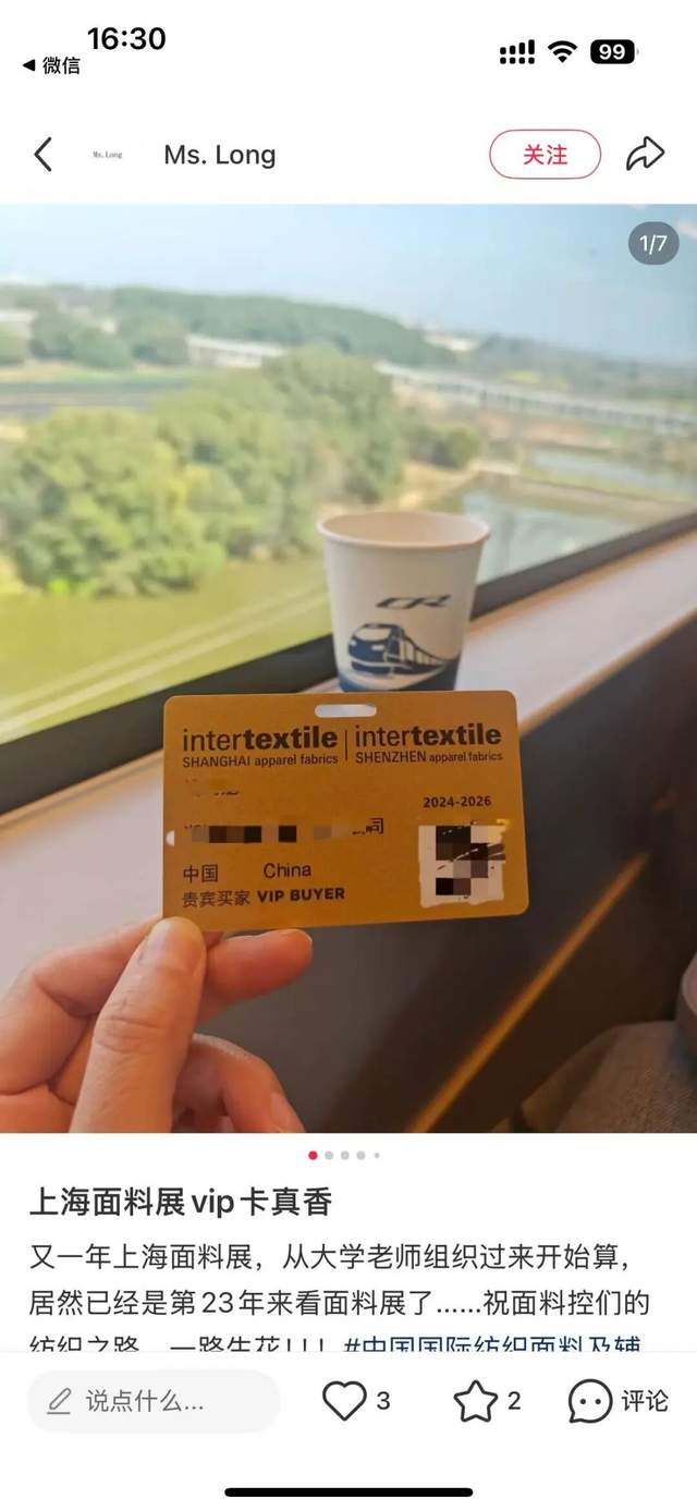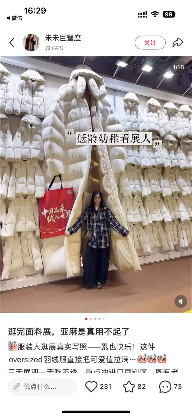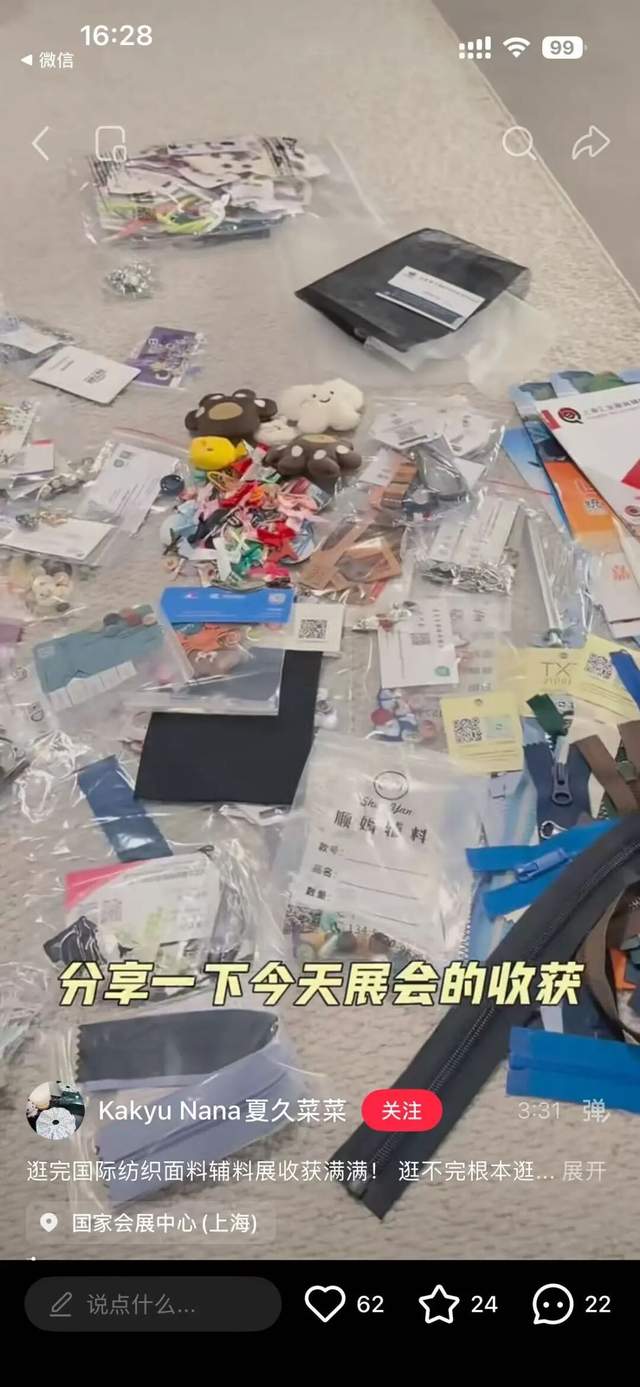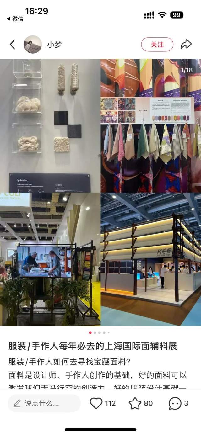 主要来看科技面料和辅料,展会上看到了一些熟悉的进口品牌、高科技面料,作为普通消费者第一次接触到产业链上的生产制造厂家,收获颇丰。此外,逛展途中还认识了很多材料领域的专家、了解了新一季流行趋势,下一届展会还会再来。
