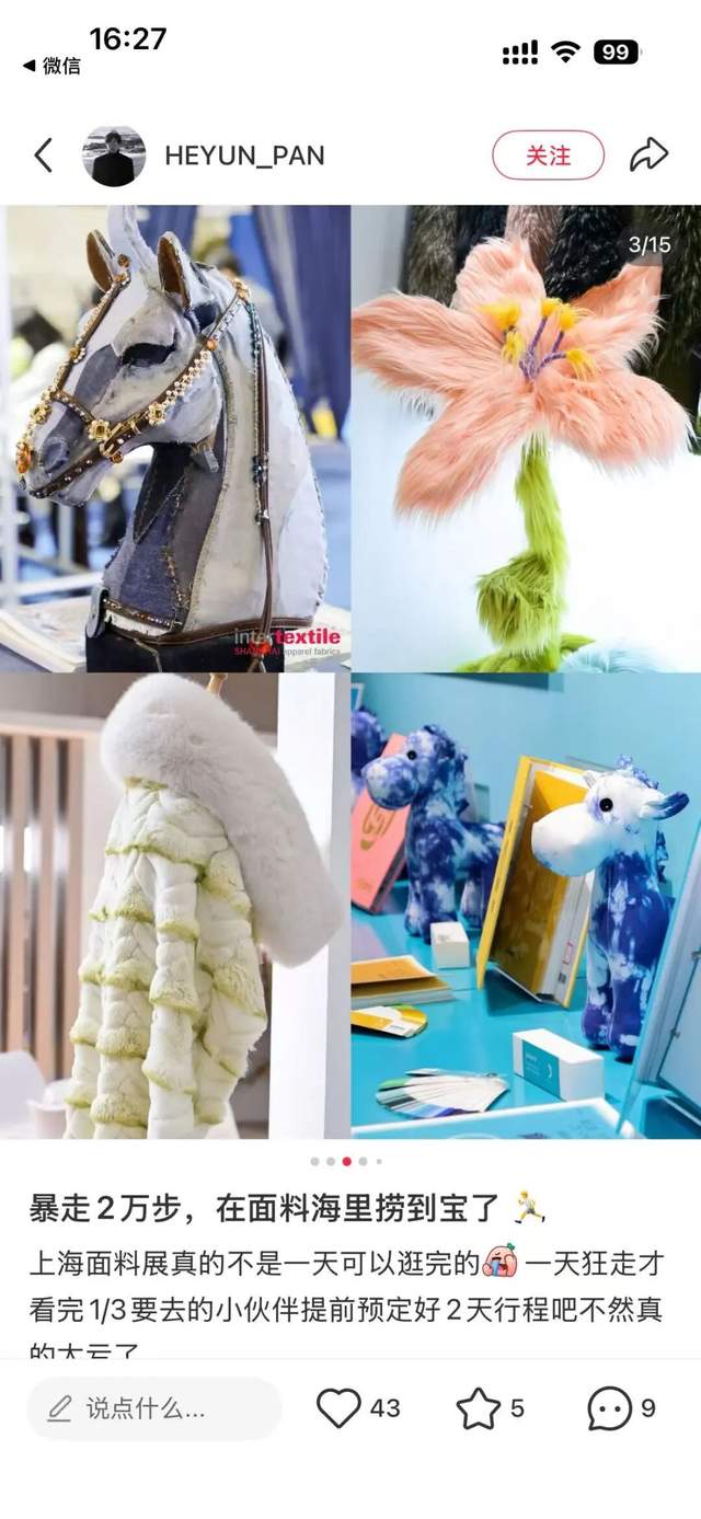 我此行主要为寻觅适配玩具产品的毛绒面料,展馆很大、企业很多,幸好有主办方的专业支持和服务,我们才能快速找到合适的产品,现场已拍摄相关样品资料,后续将持续跟进并深化合作细节。