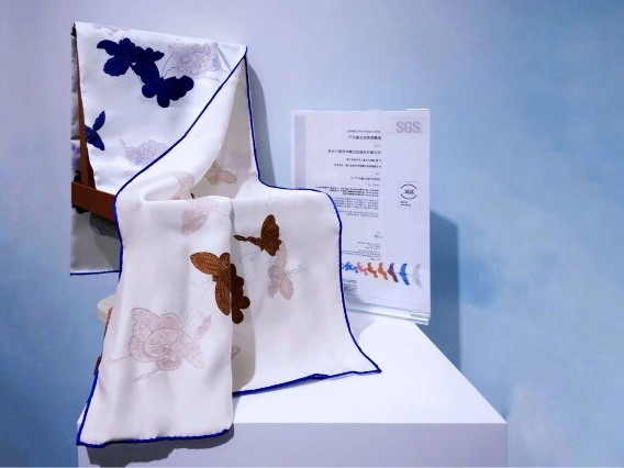 本次通过SGS碳足迹、水足迹核查的产品应用了万事利丝绸GBART数字环保印染技术所研发的新型材料。万事利丝绸副总经理马廷方先生表示,该技术使得面料与染料结合率可以达到99%以上,能够省去传统印染中不可避免的水洗环节,明显缩短工艺生产流程,同时在印染环节降低99%的污水排放量。以一条16mm,88*88cm的大方巾计算,它的克重是53.5g,用GBART无水印染技术生产可以降低4.9kg CO2e以及1.5立方米水,从而实现节能减排。