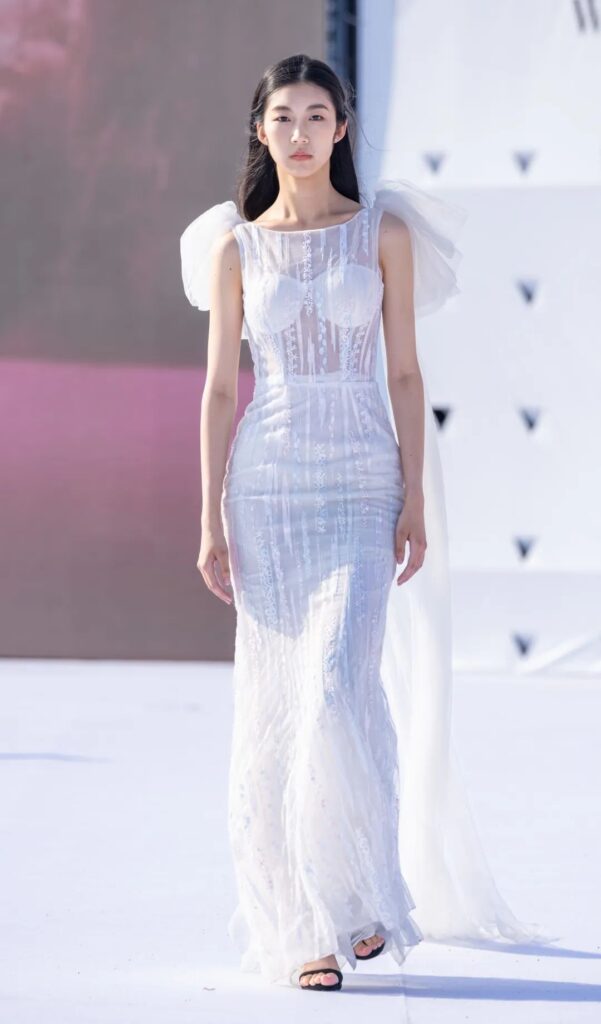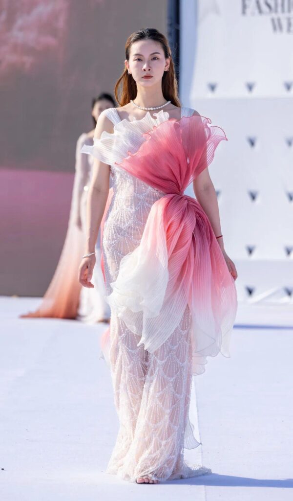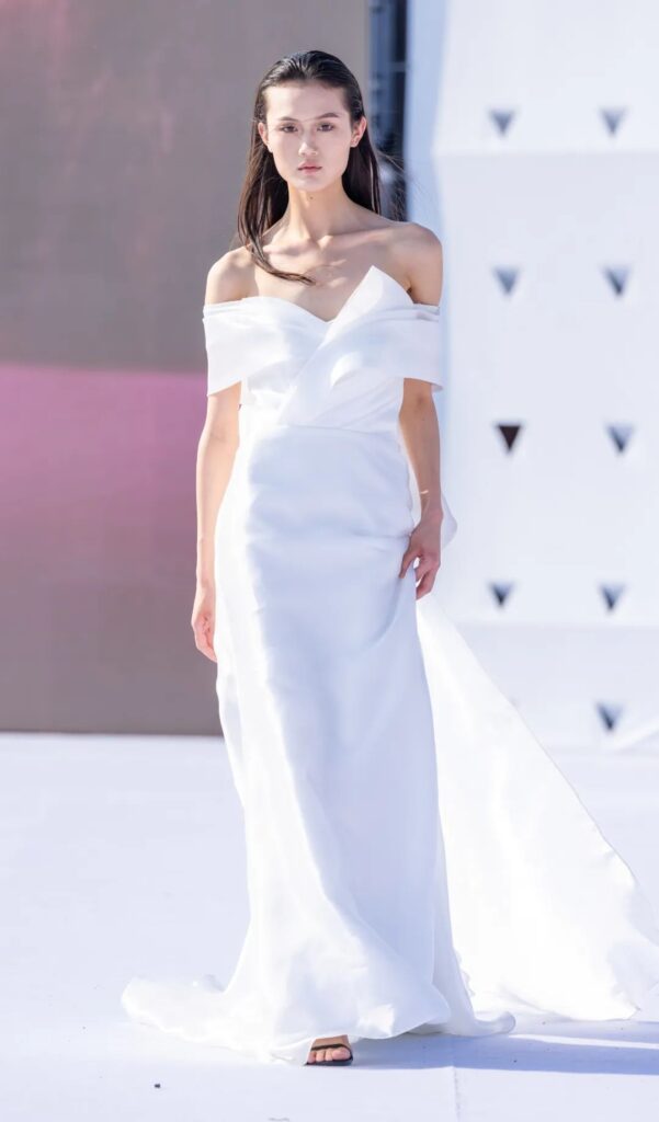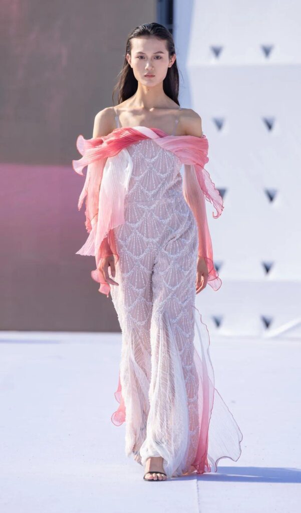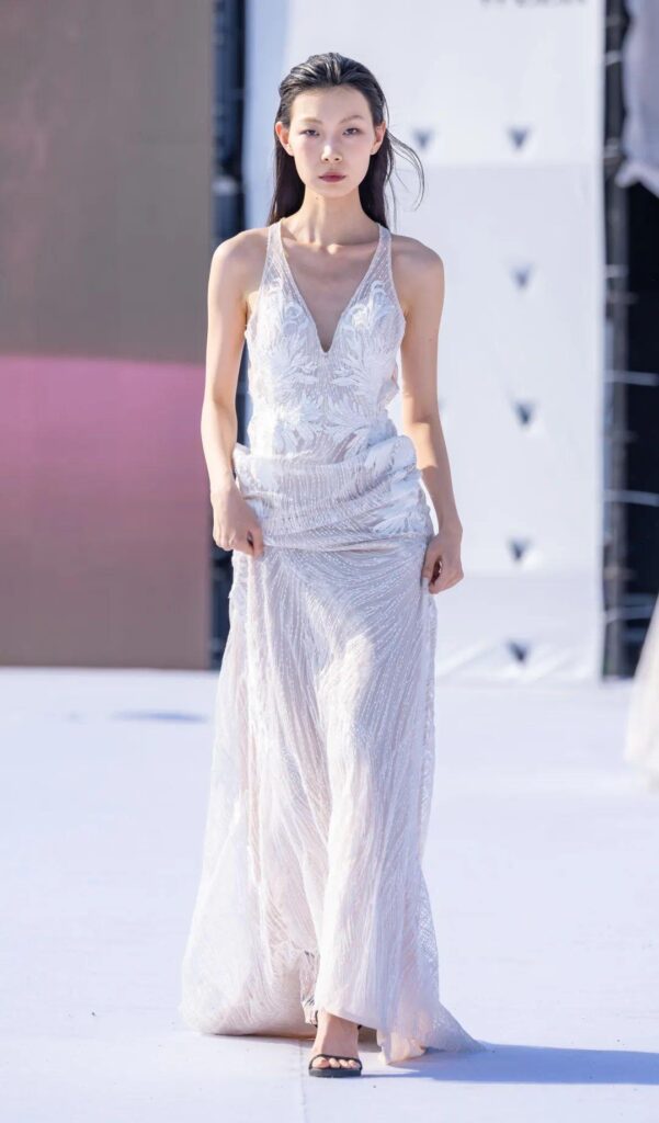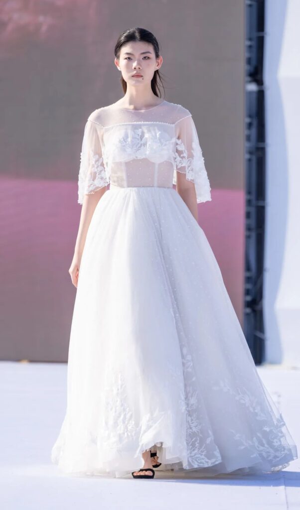 本季主题为“笙·花记”,意为“生命的乐章,花开的记忆”。系列作品致力融合中国传统元素、浪漫主义色彩和结构创新。设计中结合现代剪裁手法,巧妙融入传统服饰的精髓,呈现古典与现代的完美交融。柔美的色彩和流畅的线条,打造出带有东方韵律的唯美礼服。