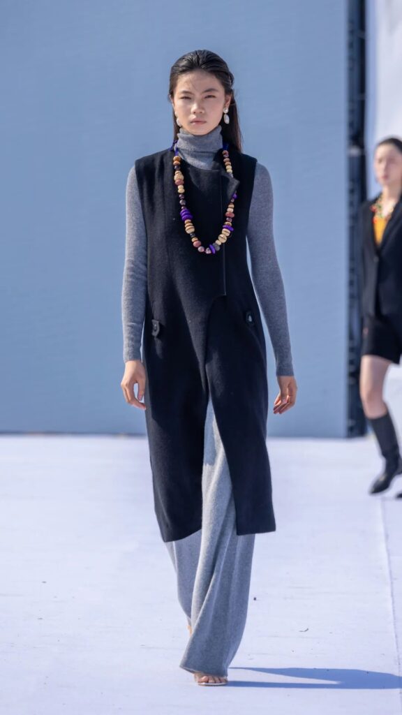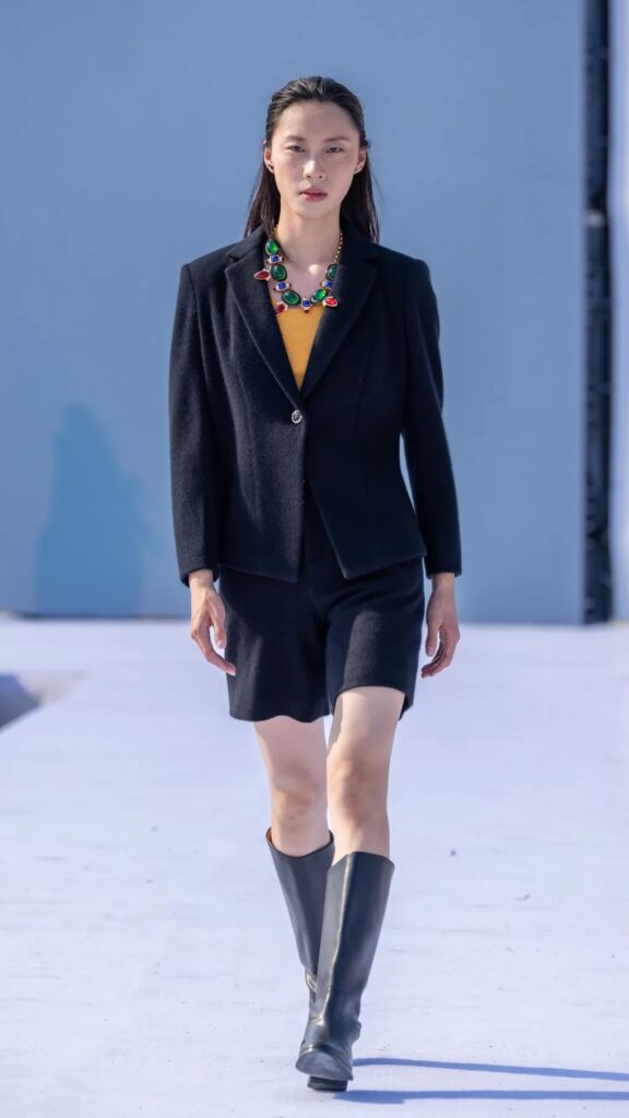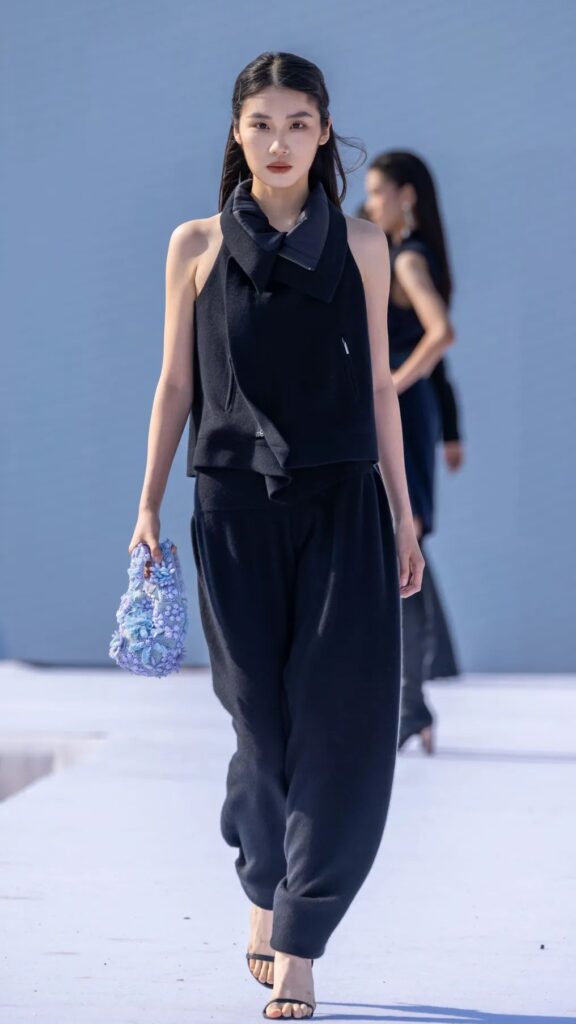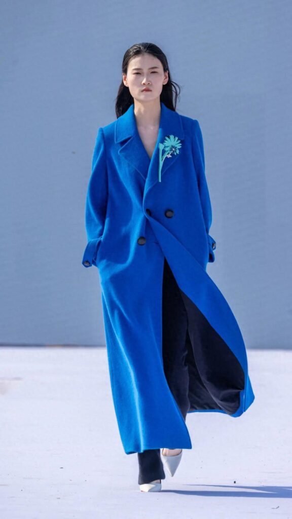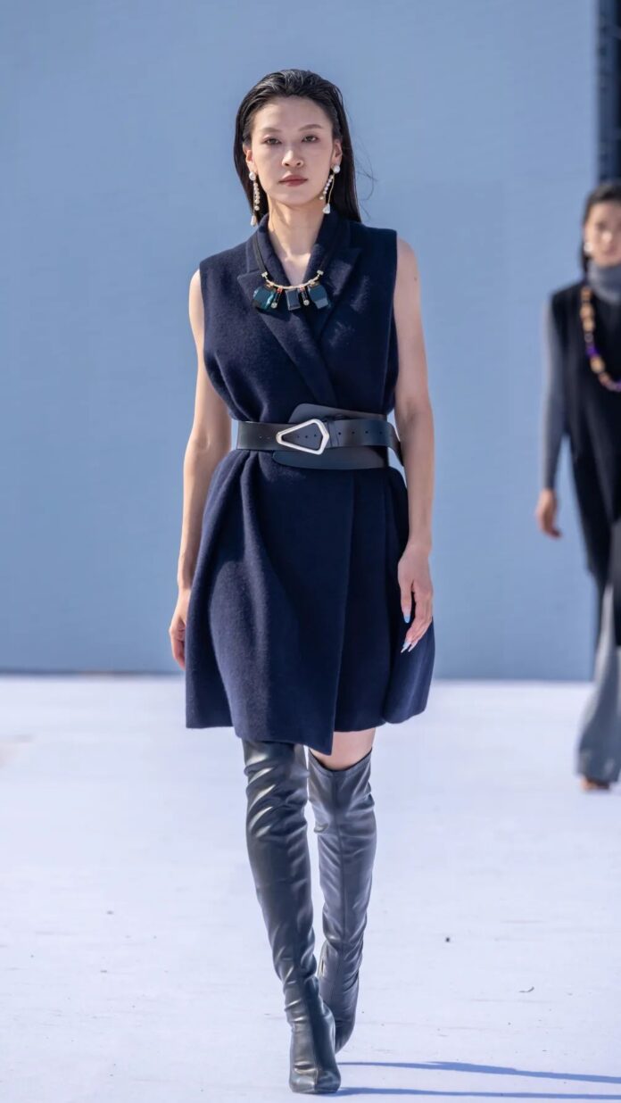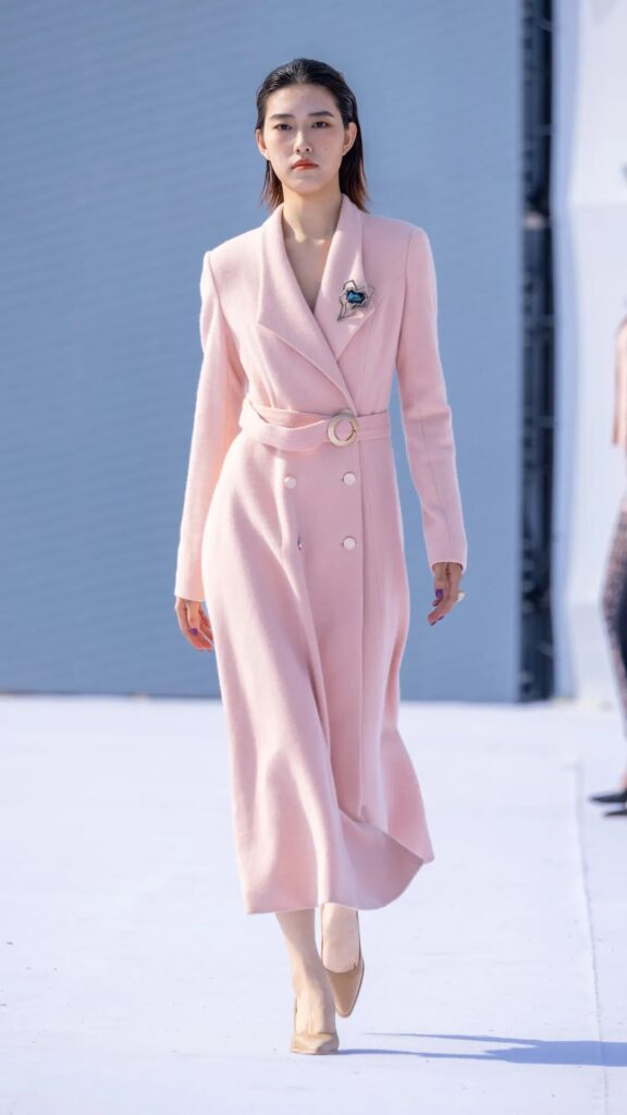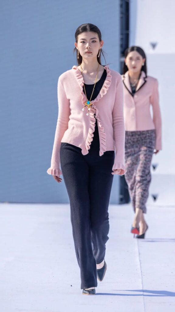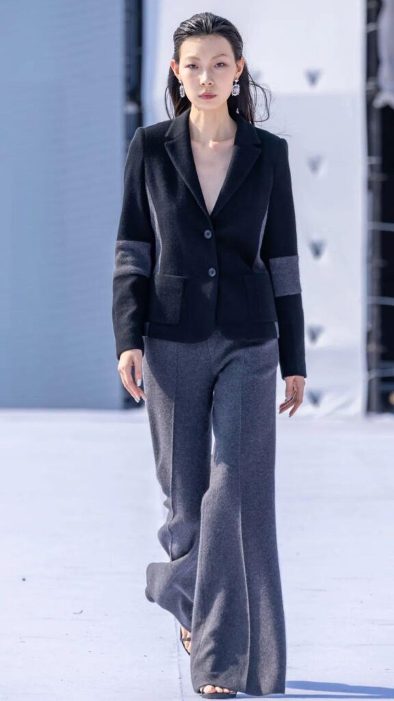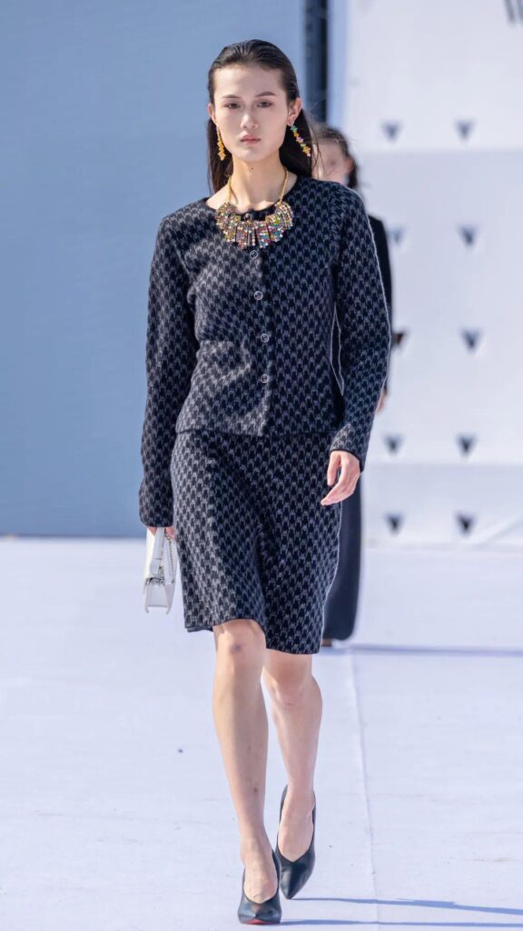 当然,本季在产品迭代、设计更新上的发力,也让观众眼前一亮。在整体easy-to-wear的风格中隐约加入了old money的风格,既持续定位了品牌典雅高级的风骨,又友好兼容了年轻人的休闲之需。金银丝的加入稳定了2024春夏跳跃丰富的颜色变化,拼色的大衣让舒适年轻化,“老花儿”的外套让女性以柔软细腻之姿重回典雅独立之地。饶有趣味的项链、腰带给兔绒带来了松弛感之外别样的因子,游刃有余的版型处理,加上兔绒的轻薄质感,将时空融为一体,季节的“固定格式”被庄淦然轻松打破。
