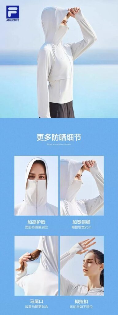 夏天是一个充满生机和极富感官体验的季节,但阳光的偏爱也是负担,找对防晒才能从容畅享夏日热情。FILA千金防晒衣集优秀的防晒性能与时尚的外观设计于一体,守护出行优雅姿态。作为一款Master层级防晒服,FILA千金防晒衣款式设计自带”心机感”无论是加高护脸、加宽帽檐,都将防晒做到极致,实现头面颈全方位一体防晒。运动加持细节满满,背部采用后背抽绳设计,松紧随心,自在应对场景切换,配以散热网孔有效提升透气性,让背部得到”呼吸自由”。马尾口和拇指扣的设计可以更契合运动场景,让你在夏日户外运动自如。此外,运动美感也有大提升,千金防晒衣采用收腰设计,百褶下摆还可修饰臀上部线条,助你线条毕露,彰显自信姿态。